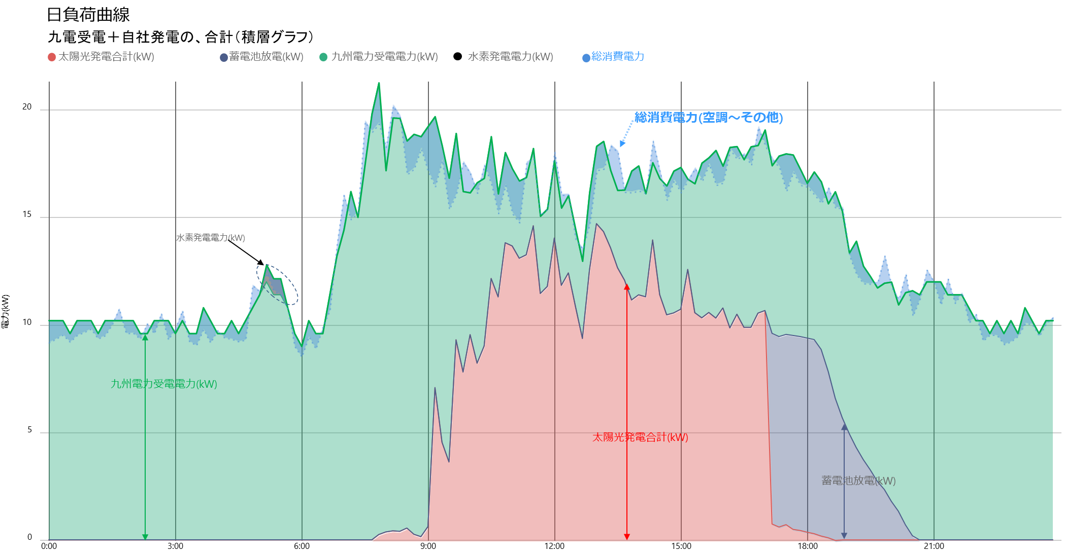 - 自社ビル発電電力量(系統からの受電、ソーラー発電、蓄電池放電、水素燃料発電、等)