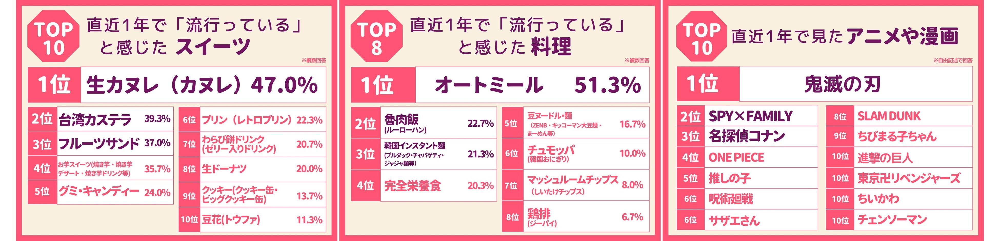 1位カヌレ、2位台湾カステラ、3位フルーツサンド、続き、お芋スイーツ、グミ、ドーナツなどが人気を集めた。50代前後の女性でも最近の流行スイーツに関しては若者世代同様にトレンド感度が高い事がうかがえる。