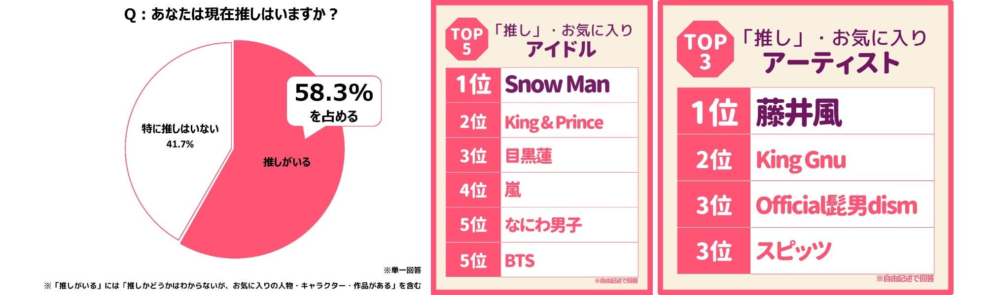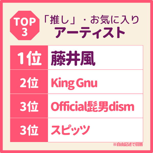 また推しのアーティストに関しては、ランキングに見られるようにいずれも直近のテレビドラマの主題歌に起用されており、50代前後の女性のテレビ視聴率の高さが影響しているとみられる。