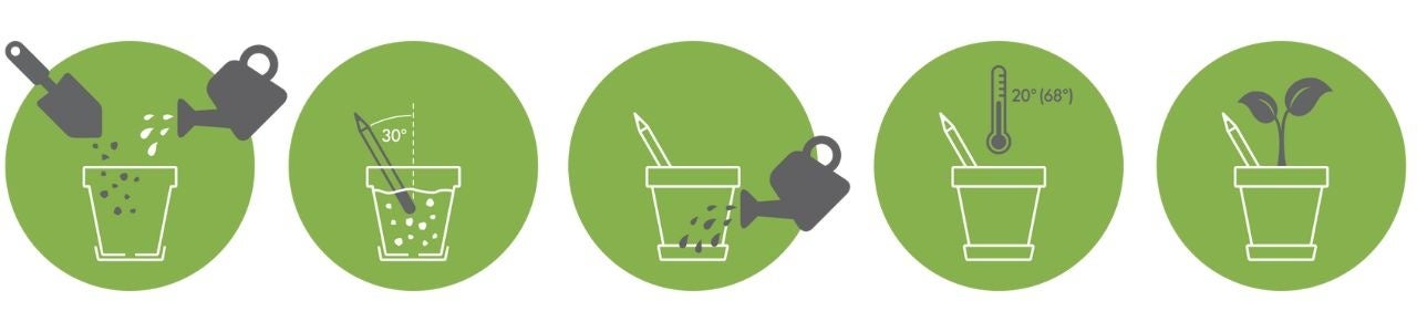 鉢植えに鉛筆を斜めに刺し、種の入ったカプセル全体が土に優しくふんわり隠れるように植えます。この際、深く埋めすぎないようにご注意ください。(※まき時や土の温度などは種子の種類、地域によって異なります。各種情報をご参照ください。)
