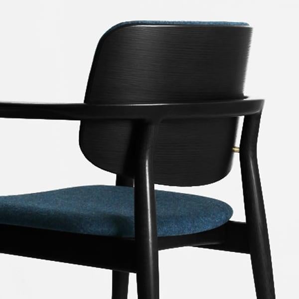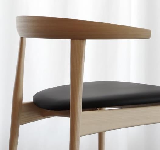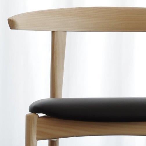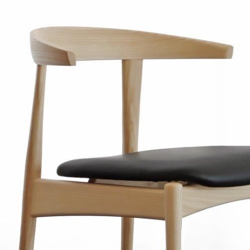 「Kimeチェア」は、Cochiチェアのイメージを踏襲しながら、より多様なシーンで使いやすいデザインに仕上げました。曲木の背部は背当たりが良く、肘掛けを兼ねたアーム部は手に馴染みやすいフォルムとし、脚部の流れるようなラインが、デザインのアクセントとなりました。簡潔かつ洗練された意匠は、背面から見た際にもその美しさを際立たせています。シンプルな構造により部品点数を最小限に抑えたことで軽量化を実現し、取り扱いやすさを向上、いつの時代どの工房でも修理できることもKimeチェアの普遍的価値を高めています。
