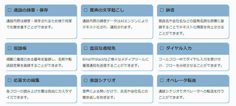 応答文の編集・ダイヤル入力による自動応答・会話シナリオ機能を使った応答・オペレーター転送など、自由度の高いカスタマイズ性で自社にあった応答設定が可能。