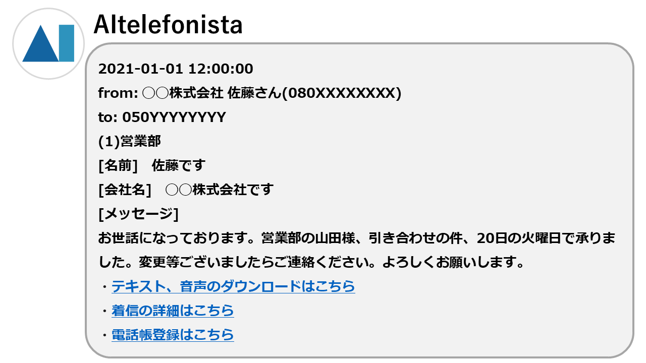 通話終了後にAIが受電内容をテキスト化し、Slackやメールなどビジネスツールに通知。