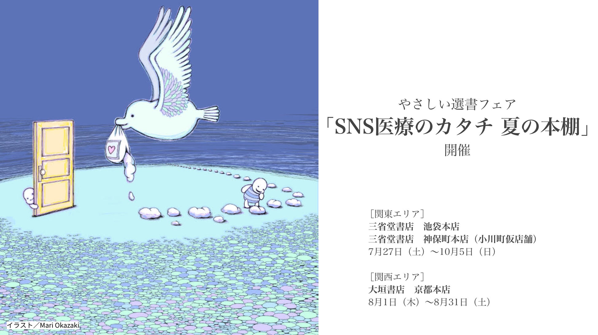 医療コミュニケーションについて考える啓発プロジェクト「SNS医療のカタチ」は、「SNS医療のカタチTV 2024 〜やさしさを届け合う〜」の開催を記念し、選書フェア「SNS医療のカタチ 夏の本棚」を三省堂書店、大垣書店と協力して開催いたします。
