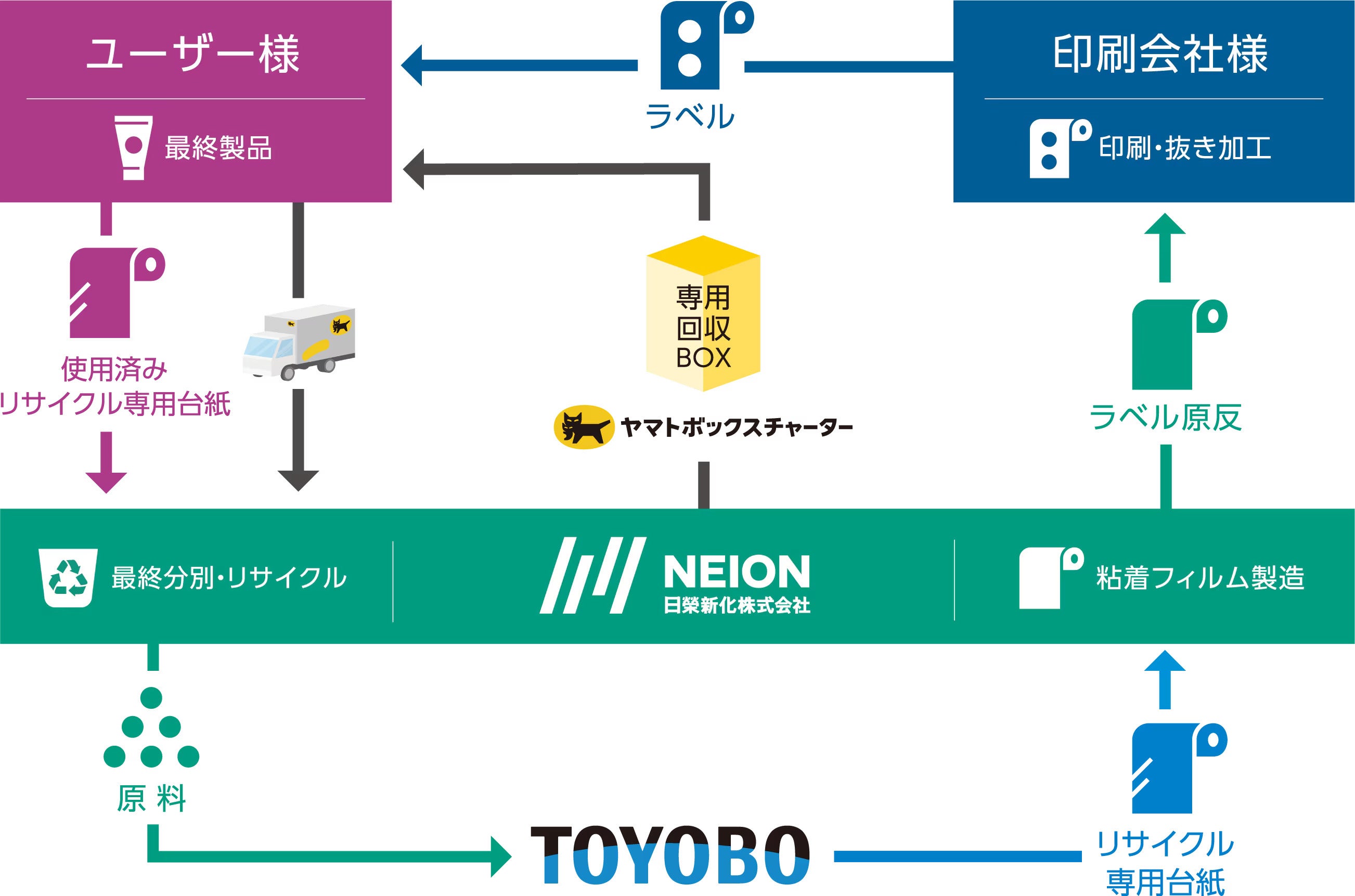 本プロジェクトは、粘着製品の総合メーカーである日榮新化株式会社が中心となり、フィルムメーカーの東洋紡株式会社、物流ネットワークを持つヤマトボックスチャーター株式会社らと共に、ラベル台紙の「捨てればゴミ、分ければ資源」を具現化する取り組みです。