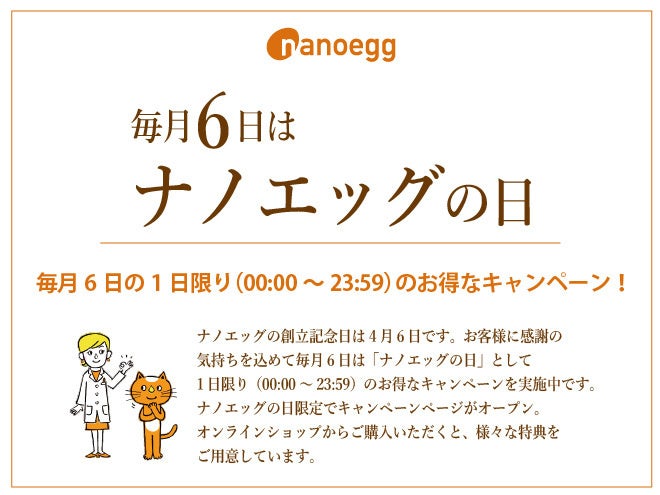 4月6日はナノエッグの創立記念日です。お客様に日頃の感謝の気持ちを込めて、毎月6日を1日限定のお得なキャンペーンの日といたします。対象日にオンラインショップでお買い上げの方にプレゼントなど特典をご用意しています。キャンペーンページは毎月6日にオンラインショップからご確認いただけます。お得な機会をお見逃しなく。