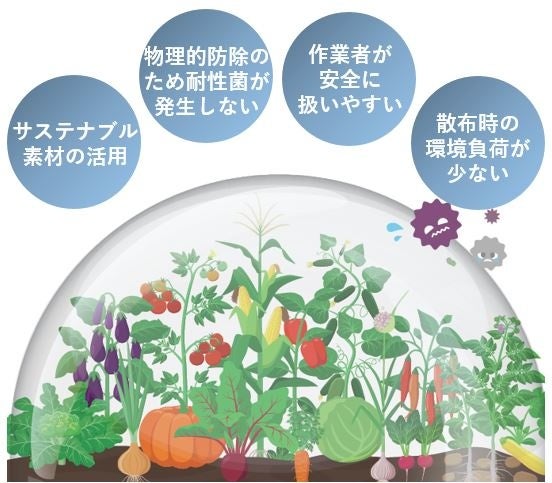 本製品は、農林水産省が策定する「みどりの食料システム戦略」で推進する総合的病害虫・雑草管理(IPM) の「物理的防除」に対応した新しい農業資材です。