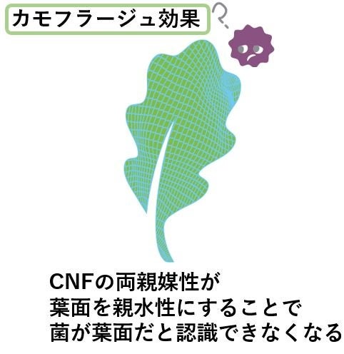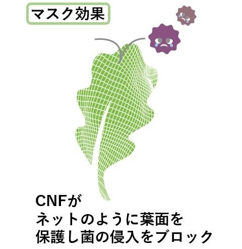 1.CNFが葉面を網状に覆う「マスク効果」で病原菌の侵入を物理的に予防します。