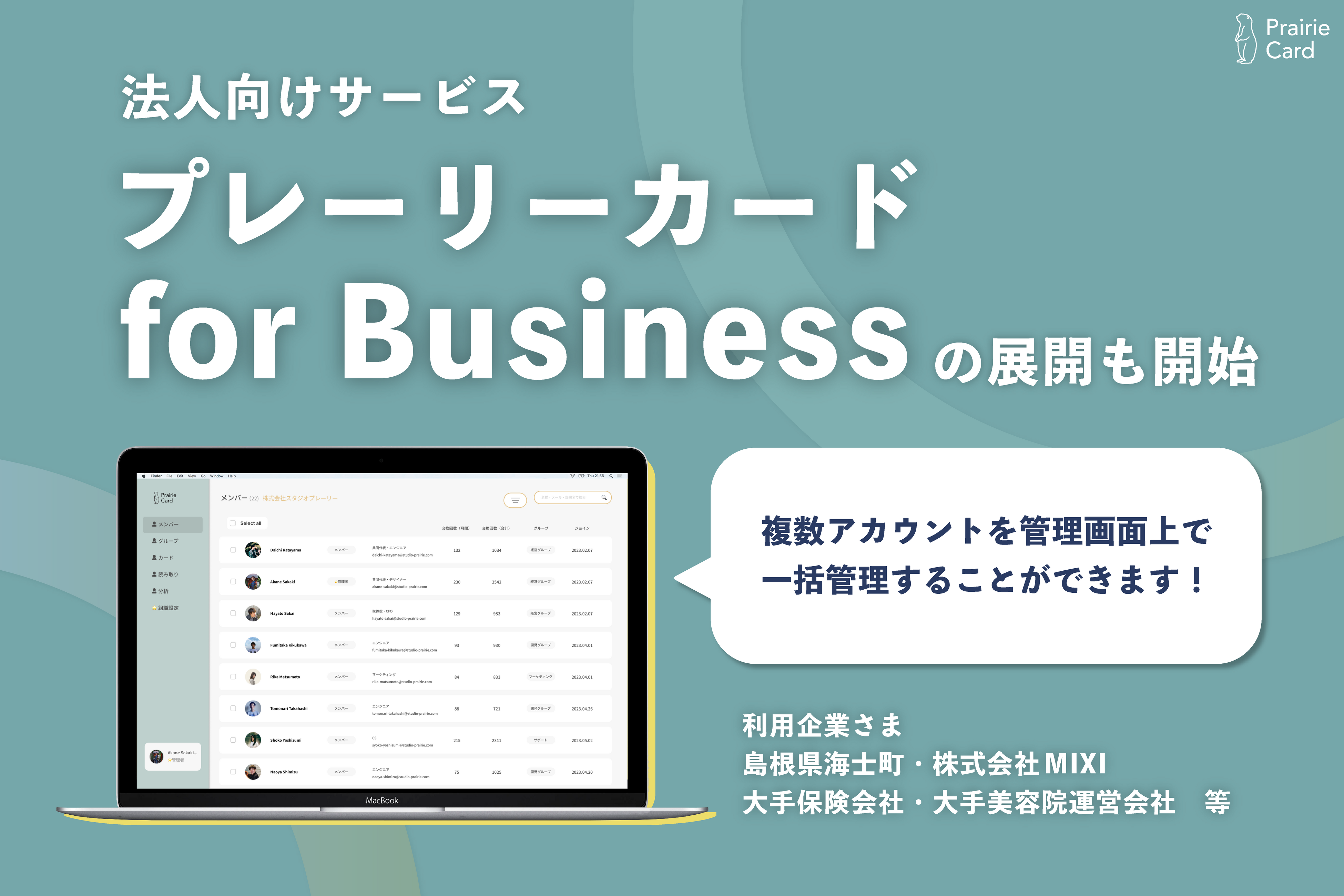直近では複数アカウントを管理画面上で一括管理することができる、法人向けサービス「プレーリーカード for Business」の展開も開始しており、自治体や大企業への導入も進んでいます。プレーリーカードを展示会で活用した結果、商談獲得数が6倍になったという定量的な結果もでています。