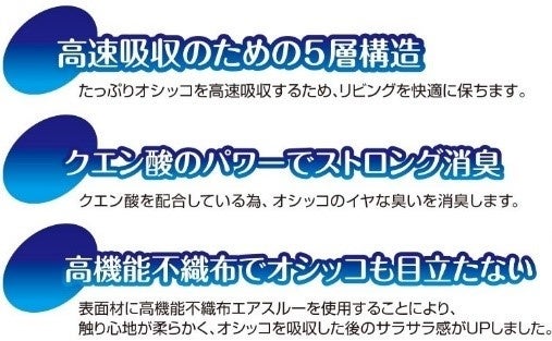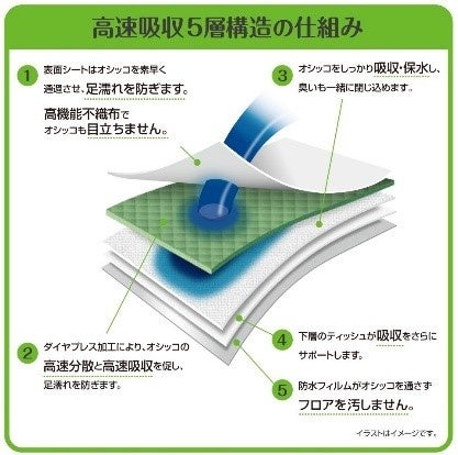 消費者調査の結果を基に、高速吸収・漏れ・足濡れトラブル改善を実現するため、エアスルー不織布を搭載し、当社独自技術であるダイヤプレス加工を施しました。ティッシュには消費者調査で好評であった爽やかなグリーンティッシュを採用し、オシッコの目立ちにくさを実現しました。さらに、クエン酸を配合することによって中和反応によるストロング消臭を実現しました。原材料には、責任ある森林管理を実現させるためFSC®COC認証を受けた綿状パルプ・ティッシュを採用、またサトウキビ由来のバイオマスポリエチレンを10%配合したパッケージを使用することで、環境に配慮した商品とし、持続可能な社会の実現に貢献しています。