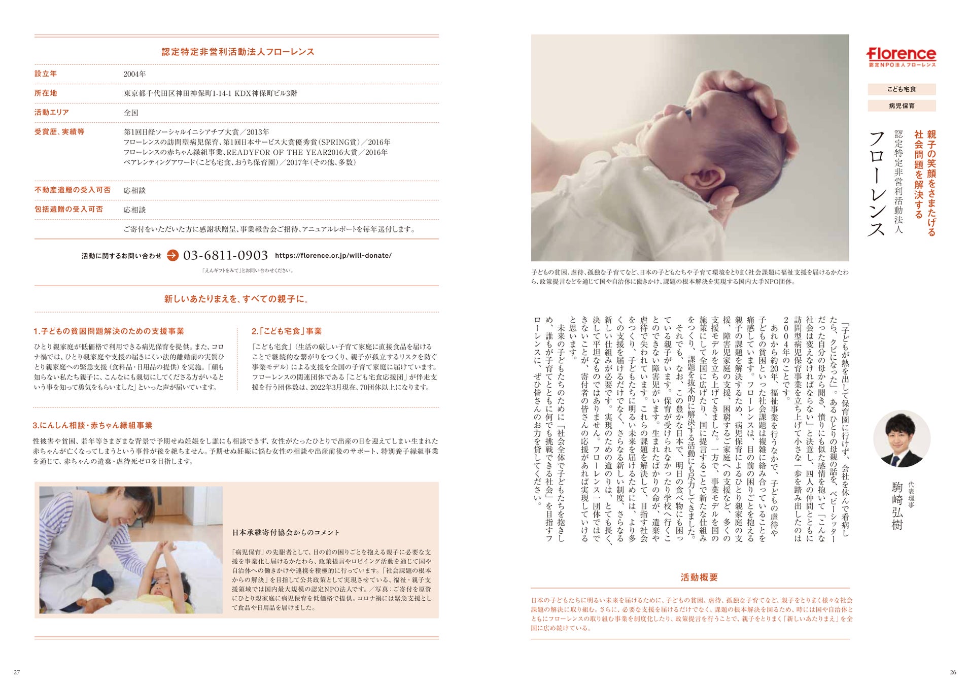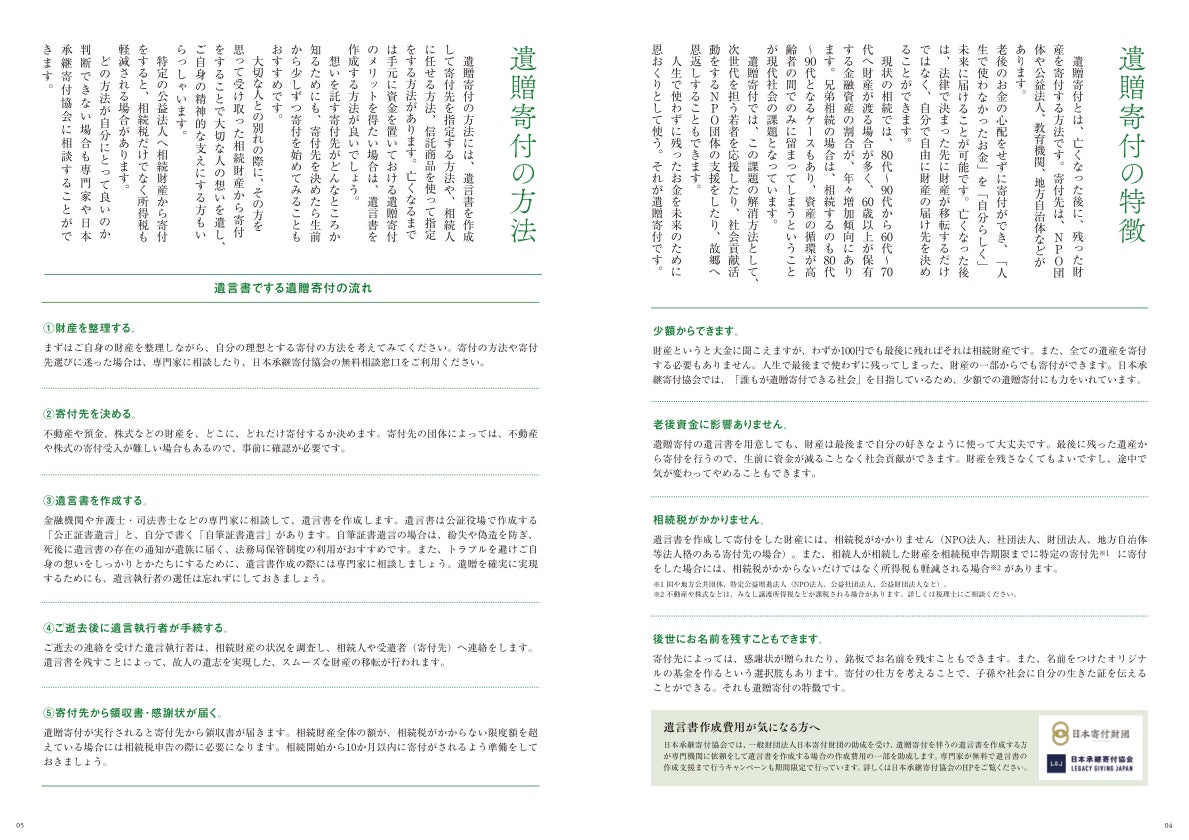 「遺贈寄付の受入」と「社会課題への取り組み」両軸の実績が豊富な団体を掲載しています。紹介ページは、活動概要がわかる団体の紹介と不動産遺贈や包括遺贈の受入可否についてや、各団体の日本承継寄付協会からのコメントにて構成しています。寄付検討者が関心をもつ領域の団体を探しやすくできるよう、「子どもたちの支援」「防災啓発」「難病支援」など各団体が取り組む社会課題もわかりやすく表現しています。また、NPO・財団・社団法人だけでなく、未来の研究や大学に寄付を希望する方に向けて「大学」への寄付の特徴や、いつかふるさとへ恩返しをしたい方に向けた「ふるさと遺贈」の紹介もしています。