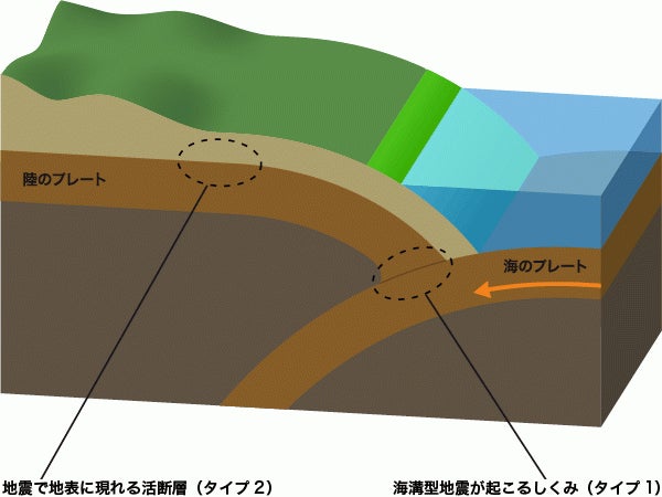 ・海と陸のプレート境界でおきる地震が「海溝型地震」(タイプ1)、陸のプレート内の弱い場所がずれて起こる地震が「活断層による地震」(タイプ2)。