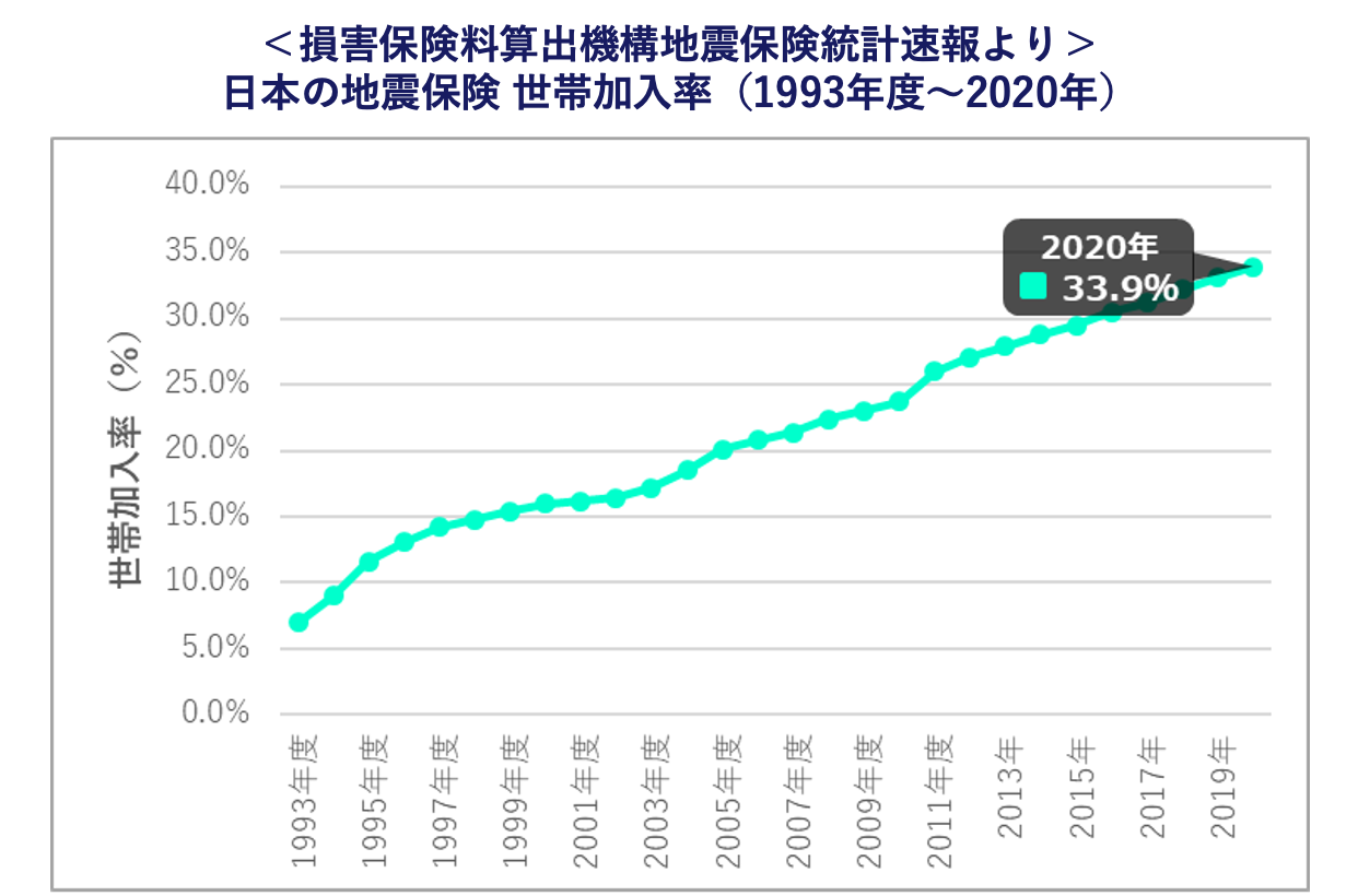 損害保険料算出機構の地震保険統計速報によれば2020年の日本の地震保険世帯加入率は33.9%と、1993年度の7.0%から27年連続で増加しています。(損害保険料率算出機構「地震保険 世帯加入率」)