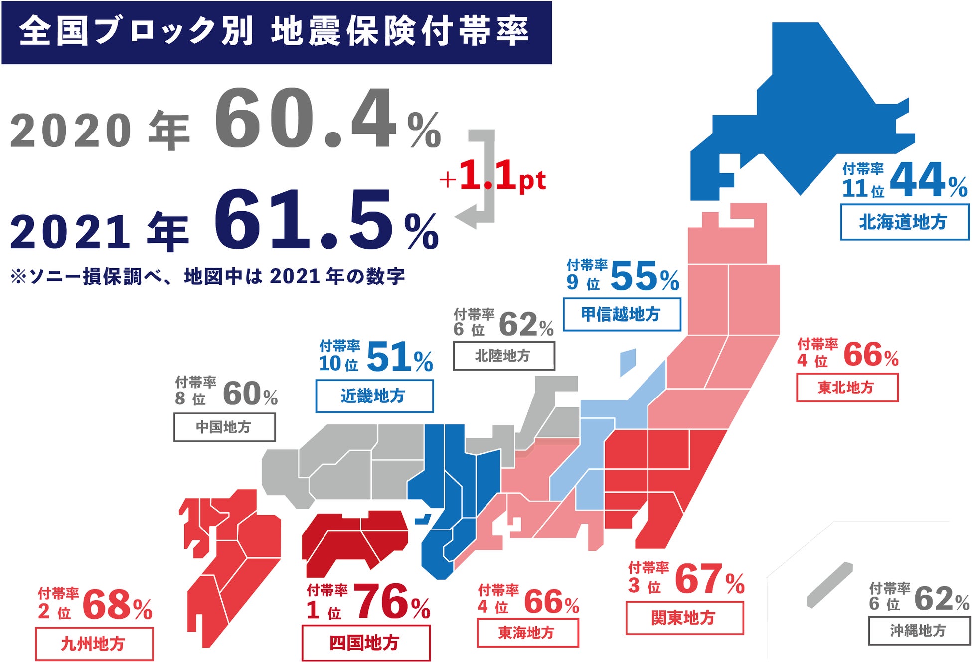 また、火災保険を契約する持ち家世帯における地震保険の「付帯率」も同様に増加傾向にあり、ソニー損保が2020年〜2021年にかけて、全国の火災保険に加入している持ち家世帯を対象に行った調査(調査概要参照)でも、付帯率は2020年が60.4%、2021年が61.5%と増加していることがわかりました。
