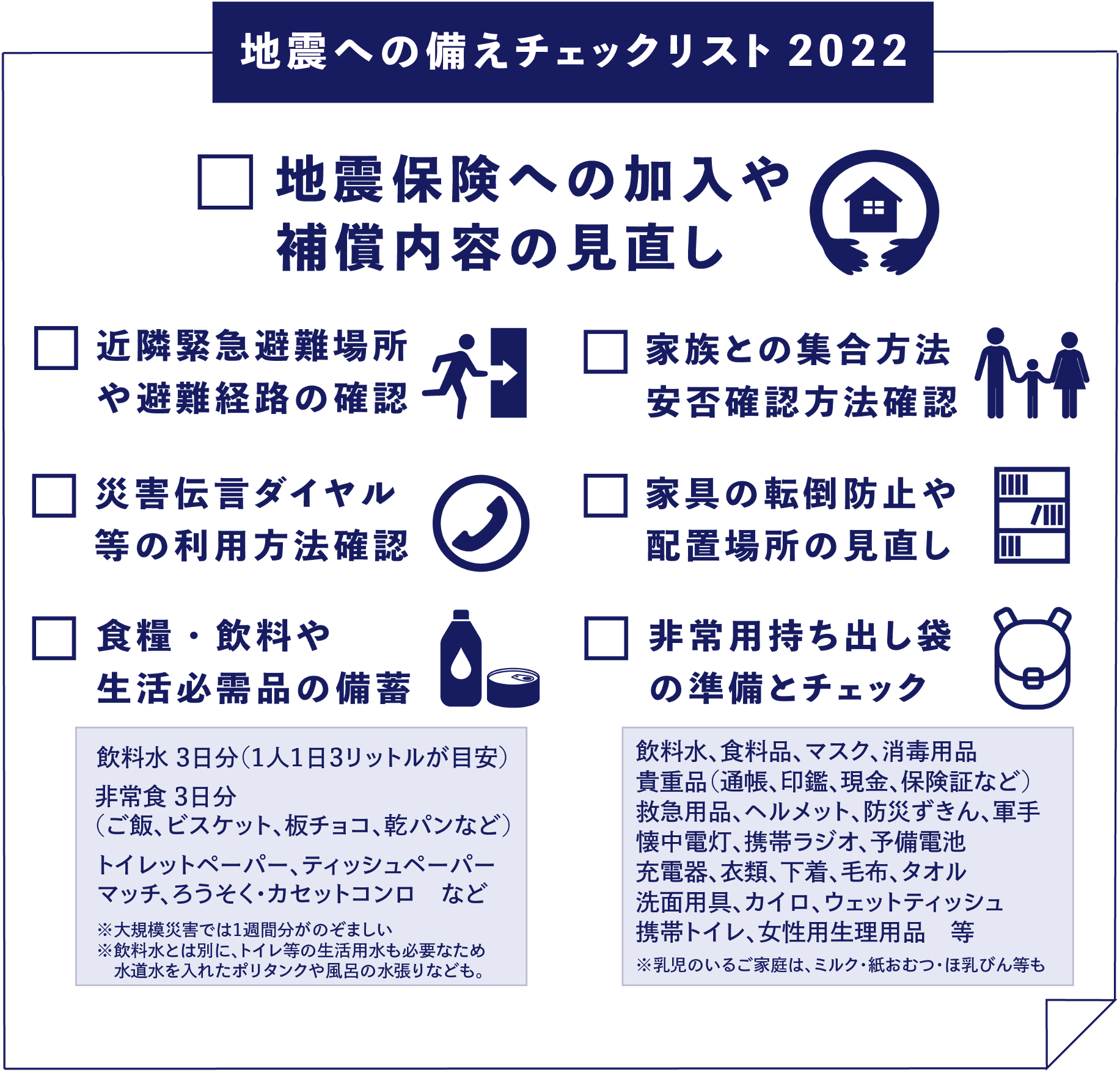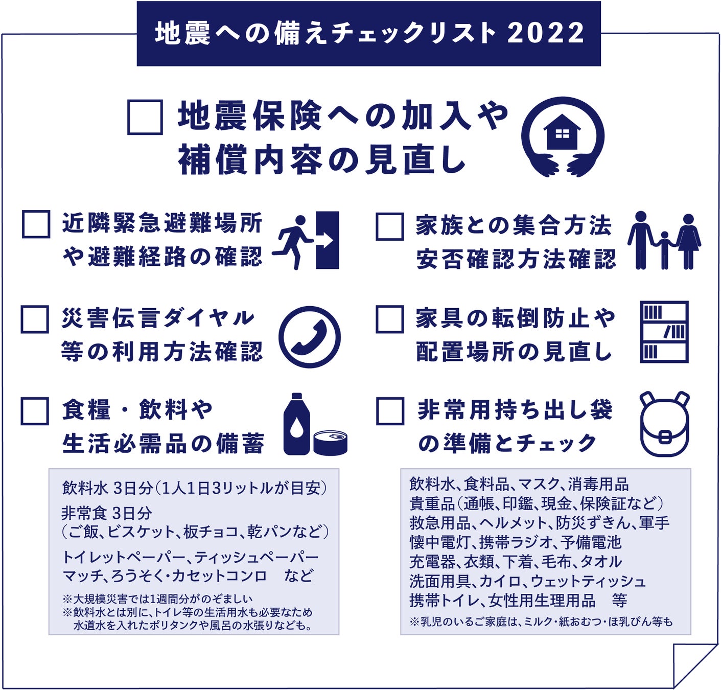 世界の中でも地震発生頻度が高い日本においては、万一の地震発生への備えは十分であるに越したことはありません。今回のニュースレターの発信にあわせてソニー損保では、地震保険をはじめとする地震への備えチェックリストをイラスト化して公開いたしました。