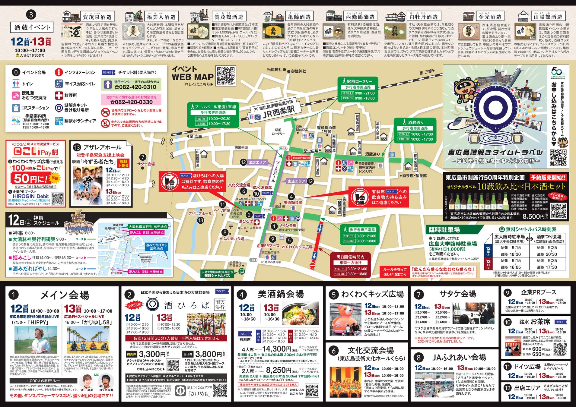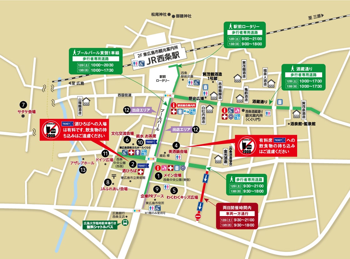 ①メイン会場 ②酒ひろば ③酒蔵会場 ④美酒鍋会場 ⑤わくわくキッズ会場 ⑥文化交流会場 ⑦サタケ会場 ⑧JAふれあい会場 ⑨企業PRブース ⑩銘水 お茶席 ⑪ドイツ広場 ⑫出店エリア ⑬アザレアホール