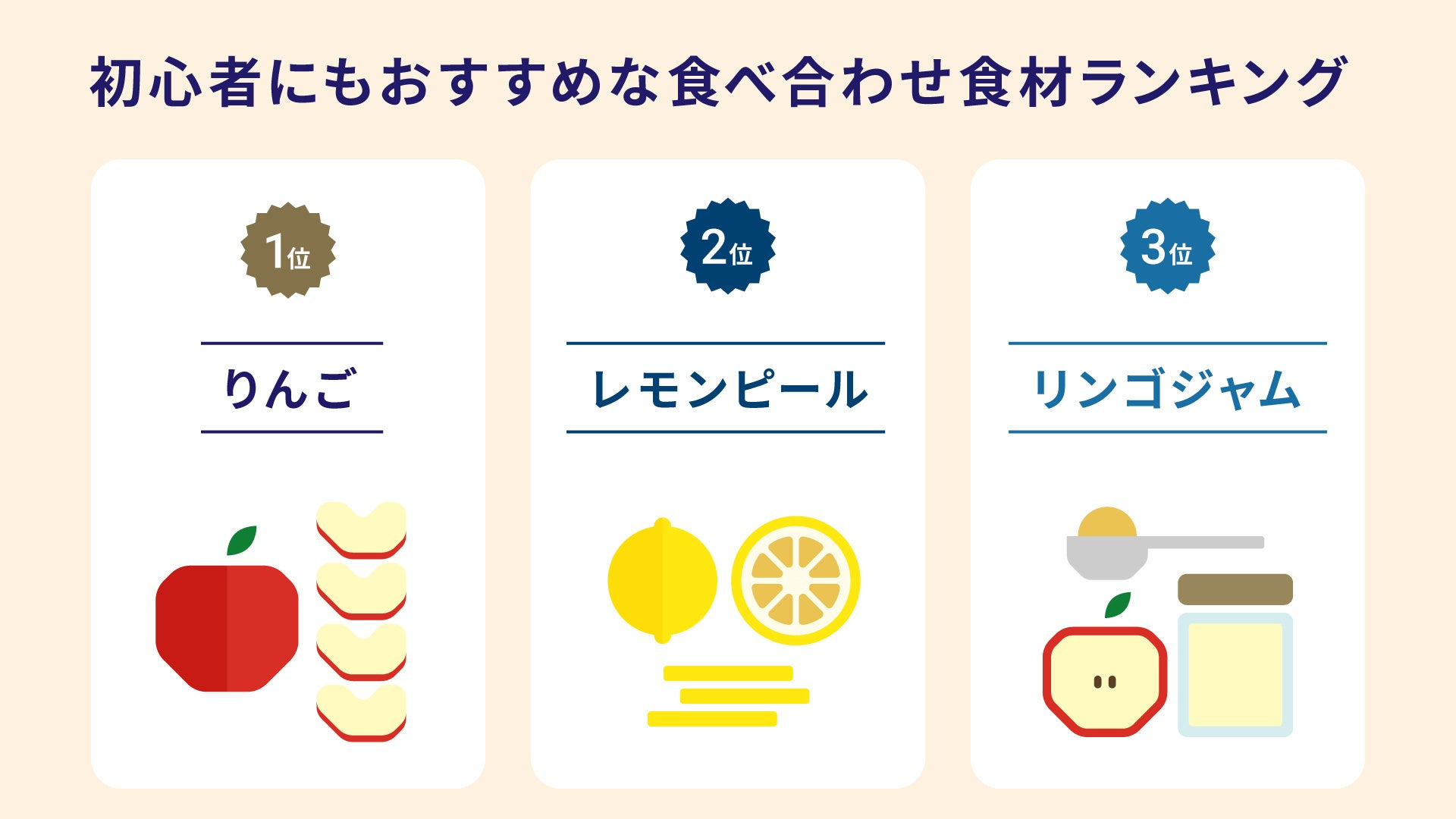 55種類の食材のうち、『初心者向けにおすすめな食べ合わせ』について聞いたところ、1位「りんご」、2位「レモンピール」、3位「りんごジャム」の順でランクインしました。1位の「りんご」は、「甘味のバランスが取れている」というコメントが多く挙げられました。