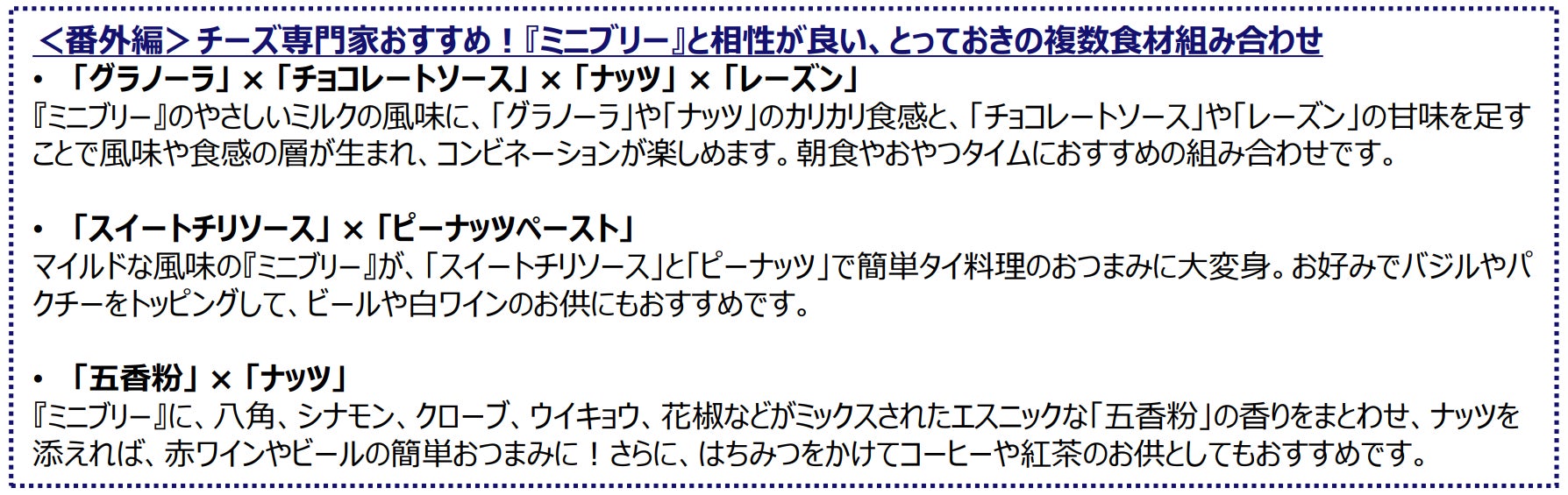 洋風部門(トリュフペースト)、フルーツ・野菜部門(レモンピール)、和風部門(白味噌)とカテゴリーが異なる食材がランクインしていることからも、『ミニブリー』が多様な食材と相性が良い事が伺えます。