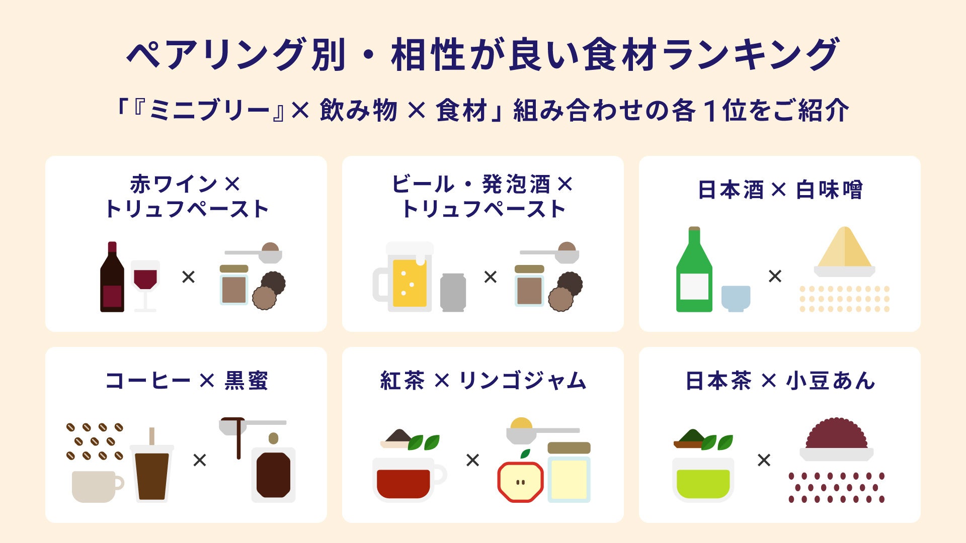 そこで、「赤ワイン」「ビール・発泡酒」「日本酒」「コーヒー」「紅茶」「日本茶」の6種類を対象に、『ミニブリー』×『相性の良い食材の食べ合わせ』についても聞いたところ、各ドリンクの1位は、「赤ワイン」と「ビール・発泡酒」は「トリュフペースト」、「日本酒」は「白味噌」、「コーヒー」は「黒蜜」、「紅茶」は「リンゴジャム」、「日本茶」は「小豆あん」の結果となりました。