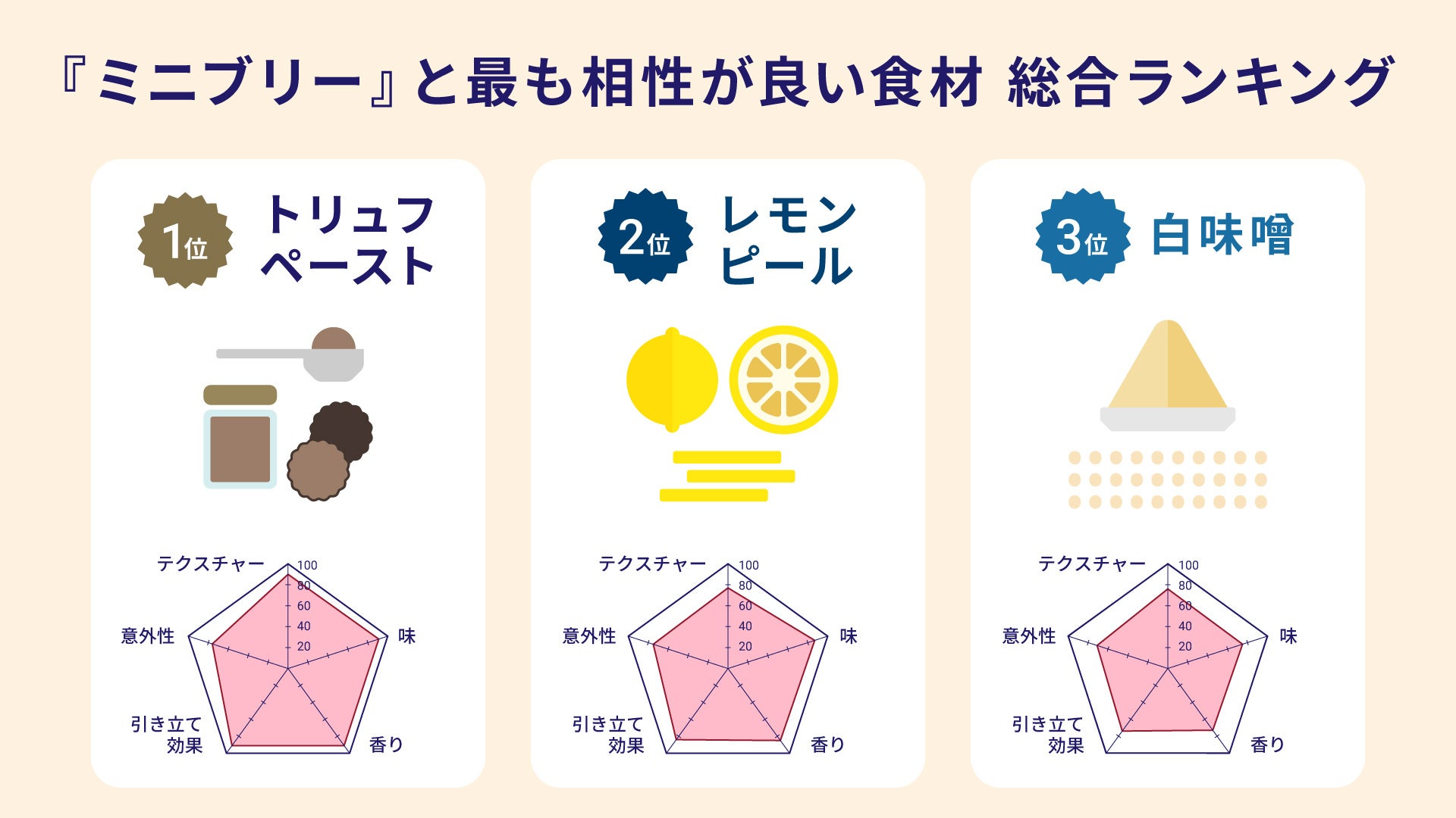 今回、食材55種類との食べ合わせを、「味」「香り」「味わいの引き立て効果」などを軸に、『最も相性が良いと感じた食材』について調査※した結果、「トリュフペースト」が総合ランキング1位を獲得しました。次いで、2位には「レモンピール」、3位には「白味噌」がランクインしました。