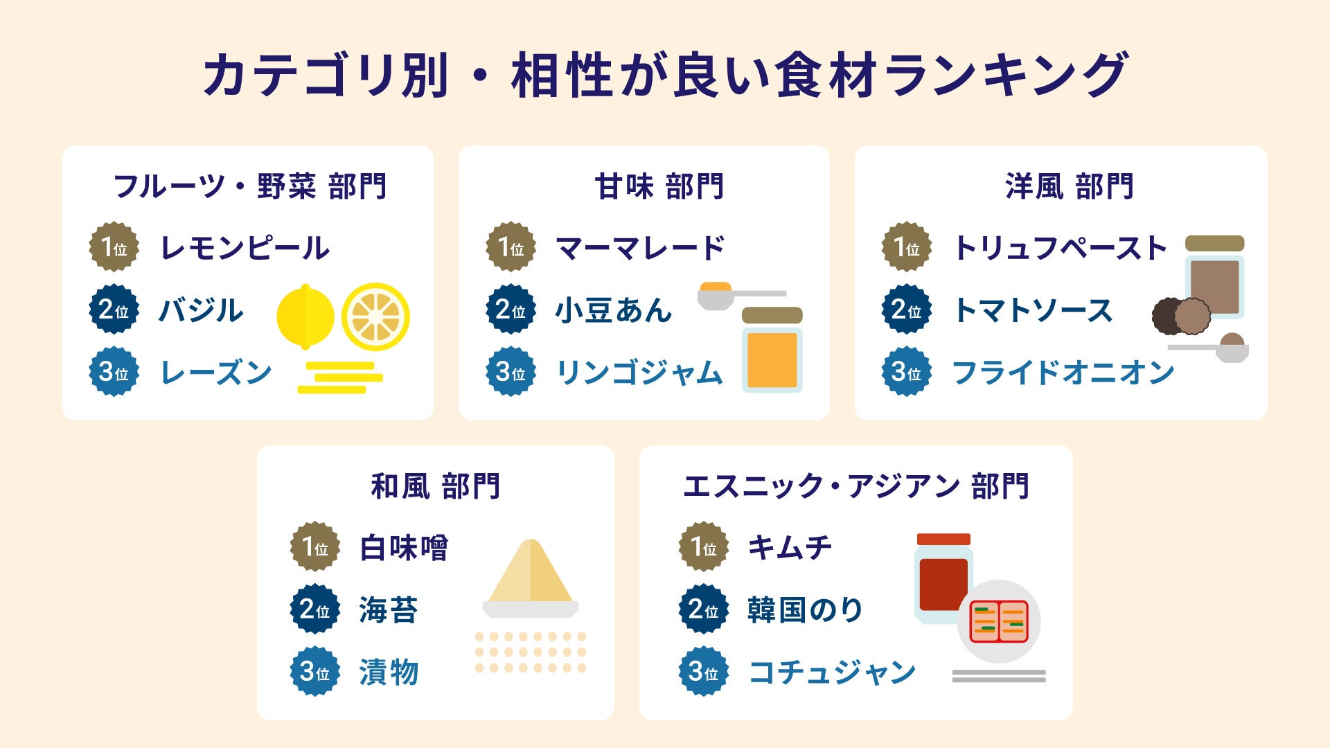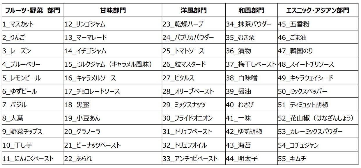 55種類の食材を、5カテゴリー(フルーツ・野菜部門、甘味部門、洋風部門、和風部門、エスニック・アジアン部門)に分け、それぞれのカテゴリーにおける相性の良い食材について聞いたところ、各部門の1位は、「フルーツ・野菜部門:レモンピール」、「甘味部門:マーマレード」、「洋風部門:トリュフペースト」、「和風部門:白味噌」、「エスニック・アジアン部門:キムチ」という結果となりました。