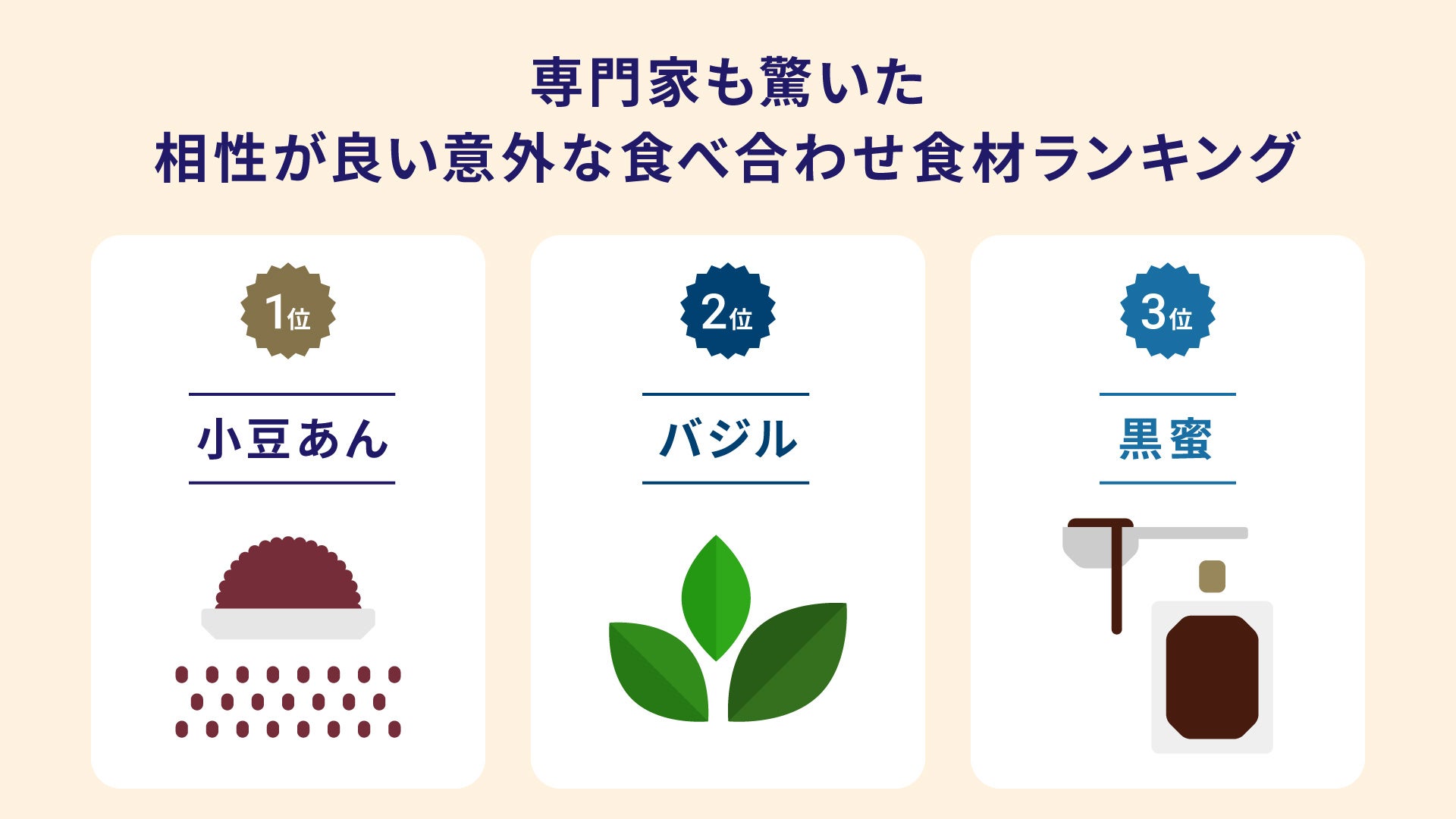 実際に組み合わせてみると想定以上の美味しさだった『意外性のある食材の組み合わせ』について聞いたところ、1位「小豆あん」、2位「バジル」、3位「黒蜜」という結果になりました。1位の「小豆あん」は、「 『ミニブリー』の塩味に餡の甘じょっぱさがマッチしていた。香りもミルクのコクも増し、予想外の相性で驚き。」とのコメントが挙げられました。