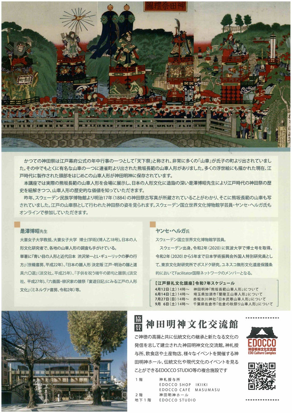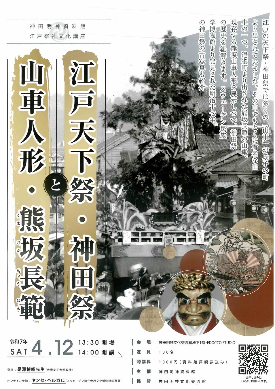 昨年、スウェーデン民俗学博物館に明治17年(1884)の神田祭古写真が所蔵されていることがわかり、当時の熊坂長範の山車の写真も所蔵されておりました。この講演会ではこの明治17年の古写真群を初公開致します。江戸の文化を継承する明治の神田祭の当時の熱気を写真でご覧いただけます。スウェーデン国立世界文化博物館学芸員のヤンセ・ヘルガ氏も特別ゲストとしてオンラインで参加いただきます。