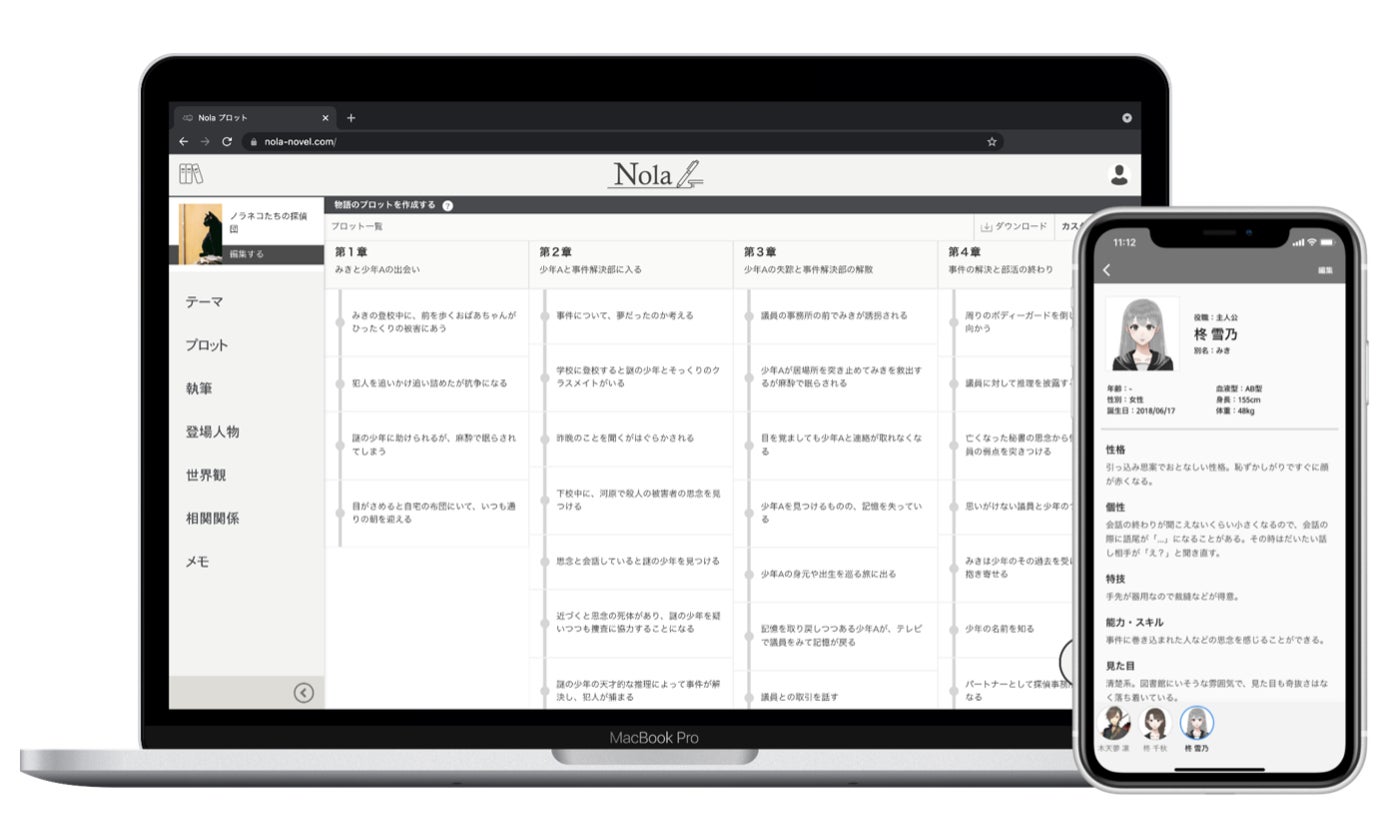 PCとスマホの双方で、データを同期して利用できることに加え、プロットや登場人物の管理などを通して、構造的な物語の創作をサポートできるのが特徴です。「物語の構成や設定を保存して、それを見ながら執筆できるサービスがあったら便利かな。」という思いから着想をはじめ、作家の皆さまとのオフ会やお問い合わせなどを通してご意見を伺いしながら、書き手の皆さまの創作の一助になるようなツールの開発や、作家デビューにつながるような取り組みに向け、動いてまいりました。原稿の執筆機能、参加資料の保存機能、プロットの作成機能で、作家様の執筆を少しでもサポートできるよう開発しております。