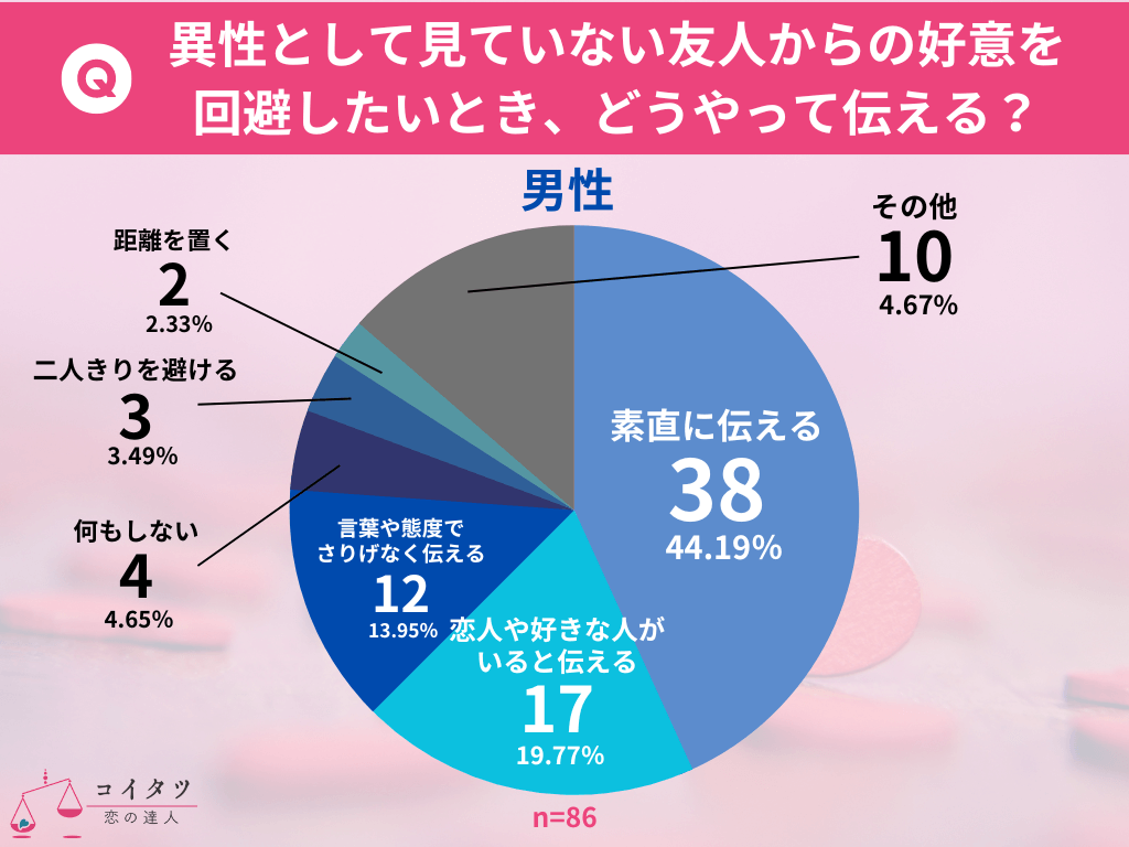 一方で男性の回答は「素直に伝える」が44%と半分に近い回答でした。傾向として面倒な言い回しはせず、直接的に相手を異性として見れないことを伝えるようです。