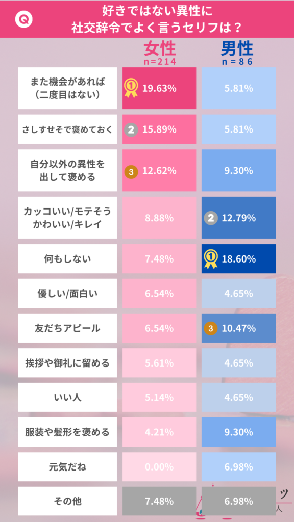 本記事では、「興味のない異性への対応/社交辞令」について、男性・女性の実際の声についてもピックアップしてご紹介しています。