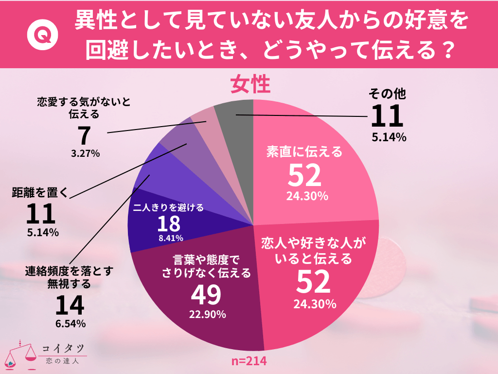 女性の回答では、「興味がないことを素直に伝える」「他に好きな人がいると伝える」「言葉や態度でさりげなく伝える」が上位となりました。