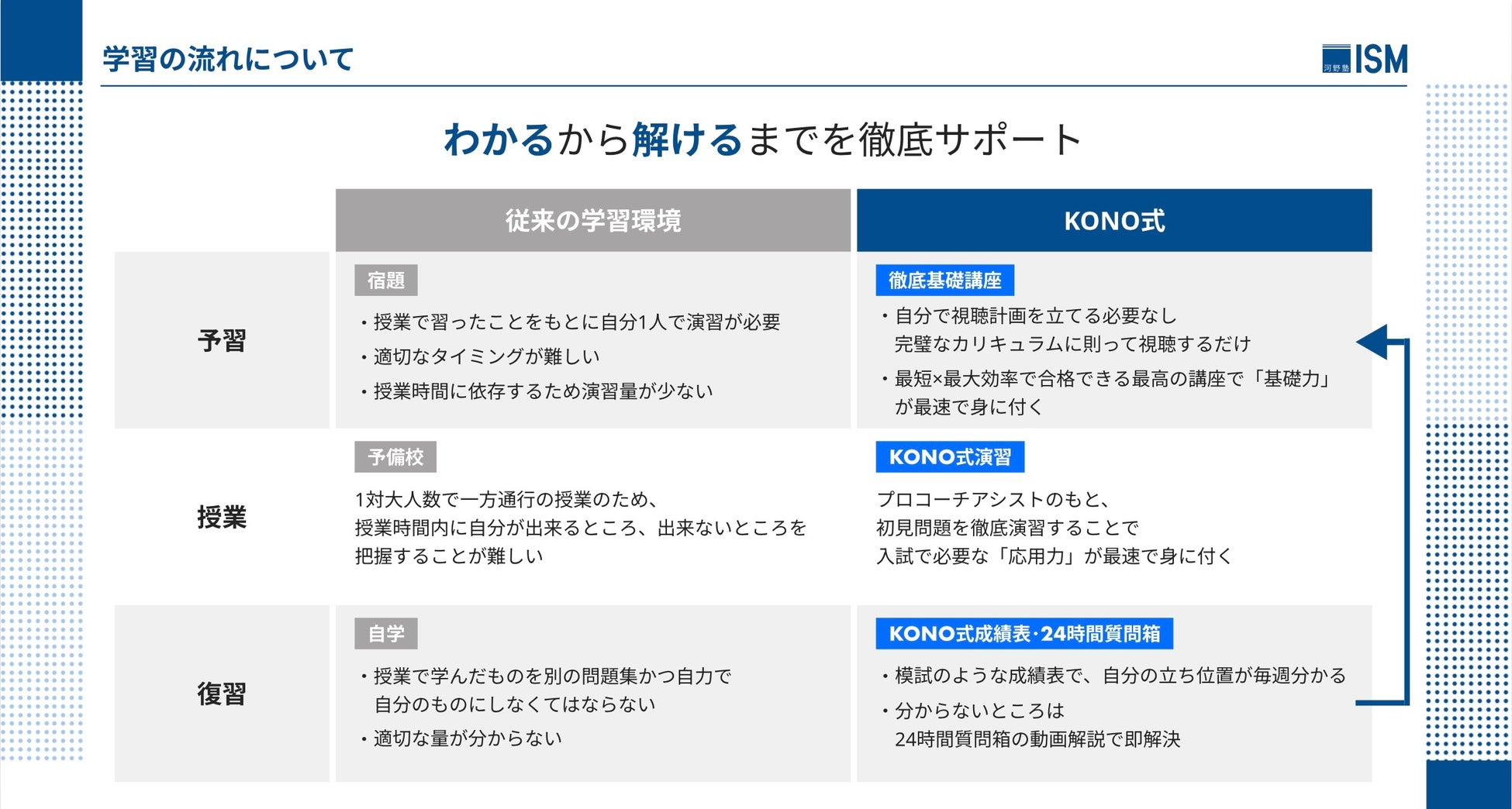 河野塾ISMは、いくつもの難関試験に挑戦し合格してきた河野玄斗の経験をもとに、受験合格に特化した効率的かつ網羅的な学習プラットフォームです。