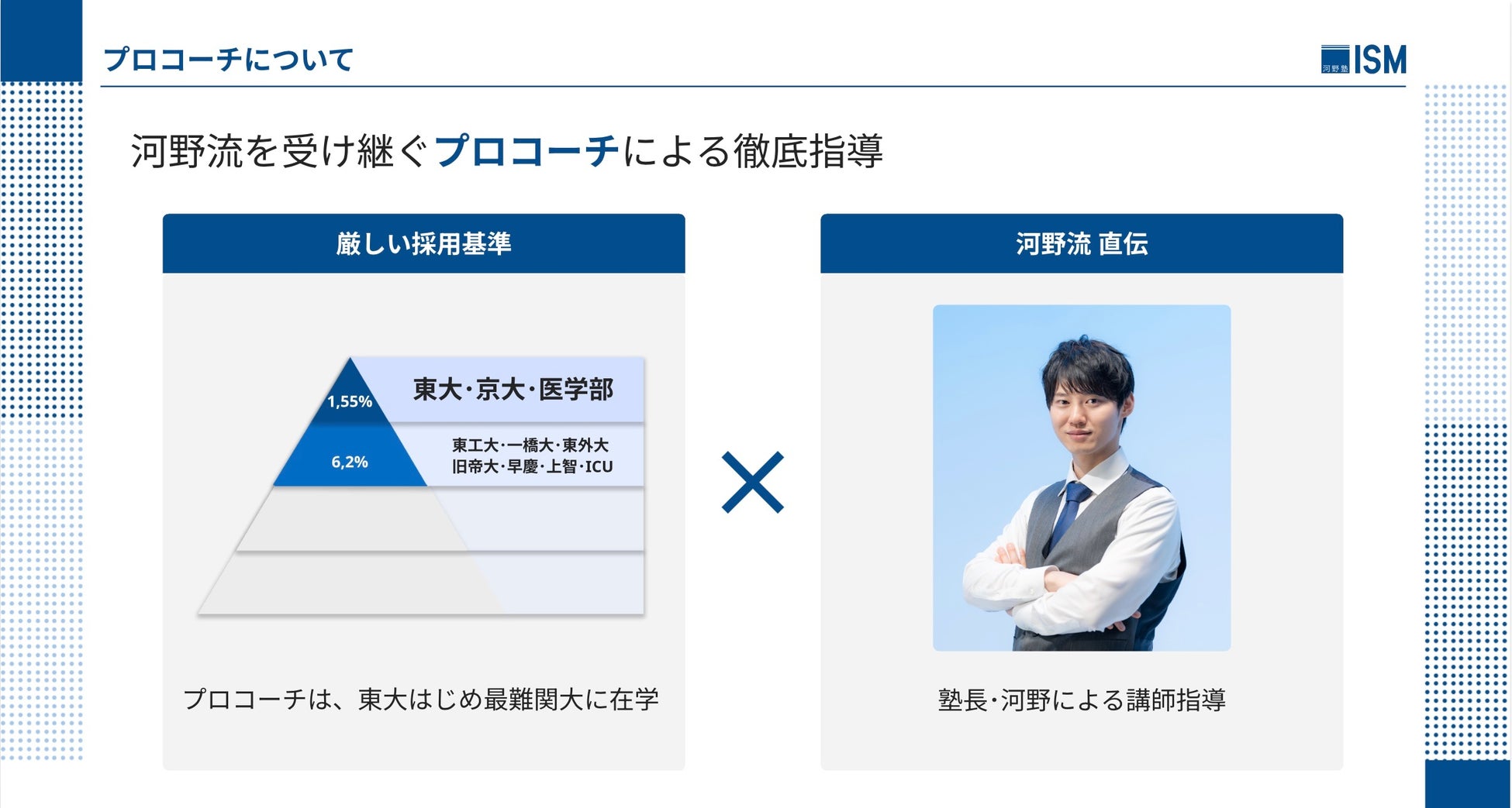 厳しい採用基準によって選ばれたプロコーチは東大をはじめとする最難関大に在学。さらに、塾長である河野玄斗の学習法・指導法を受け継ぎ、KONO式の授業を行います。
