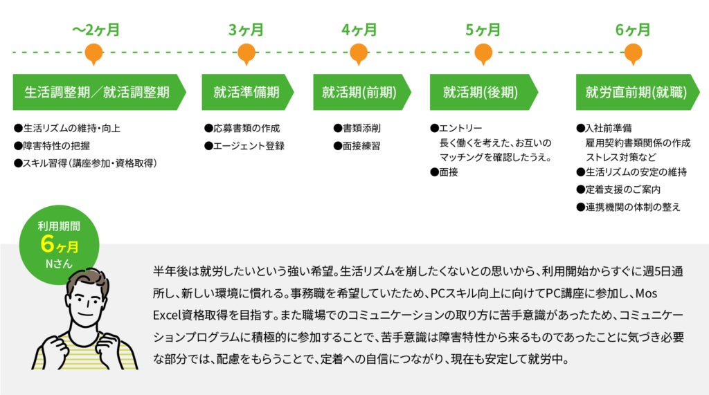 就労移行支援を利用できる期間は原則最大2年間です。2年間の中で、就職するためのスキルを身につけ、自分にあった仕事をみつけていきます。COCOCARAでは、ご本人とスタッフが相談しながら目標に向けて一緒に課題に向き合い就職を目指します。そのため、利用期間も人により様々です。COCOCARAの就職までの利用例です。