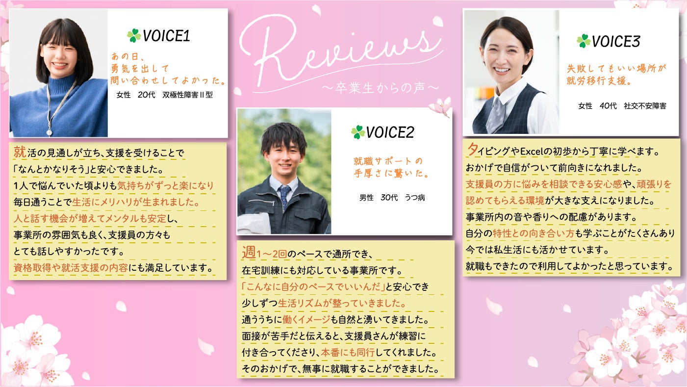 『私は外出できるタイプの引きこもりでした。メンタルクリニックに通い調子が良くなってきて、働く意欲が湧いてきたところでこちらに通所しました。決め手は、きれいで植物が多い事業所であることと、優しい支援員さんが見学の時に説明してくれたからです。初めは2年間通所して生活を整える目的でしたが、結果として約1年半で事務職に就職できました。通所をして休み時間や帰り道に話せる方々ができたことがとても嬉しく感じています。引きこもっていた時に誰かと道で話しながら歩くことに憧れていました。夢が叶って感謝しています。ありがとうございました。』