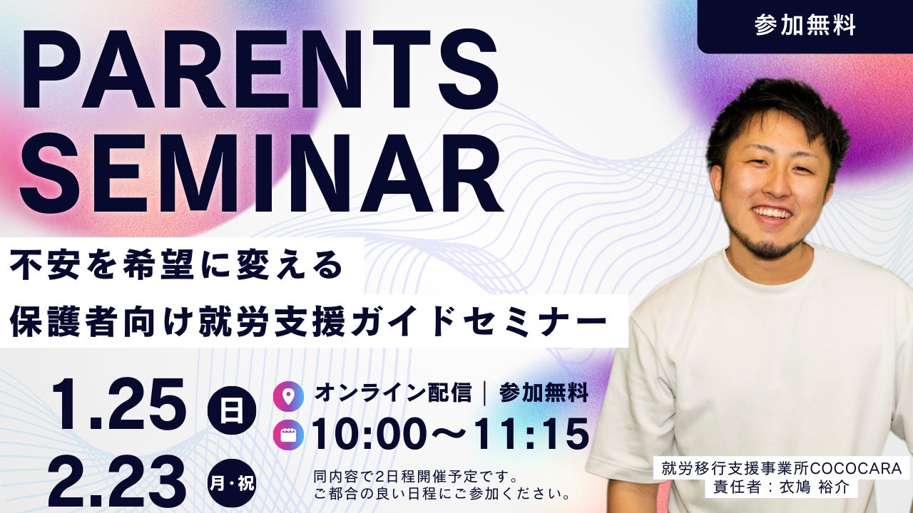 不安を希望に変える。保護者向け「就労支援ガイドセミナー」を1月25日(日)、2月23日(月・祝)に開催|就労移行支援事業所COCOCARA