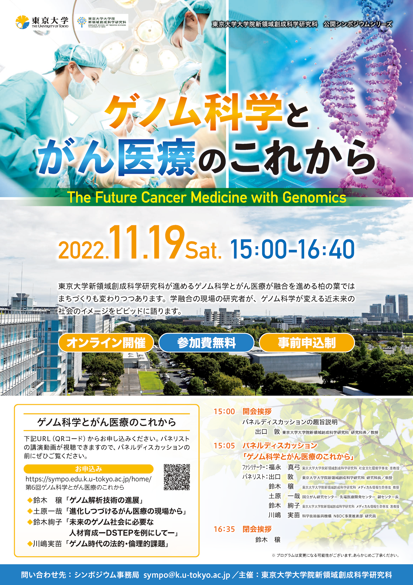 東京大学大学院新領域創成科学研究科(千葉県柏市柏の葉5-1-5、研究科長:出口敦)は、2022年11月19日(土)に公開シンポジウム「ゲノム科学とがん医療のこれから」を開催します