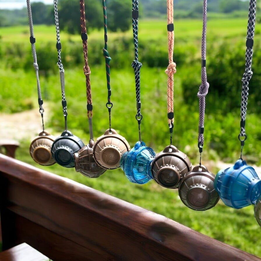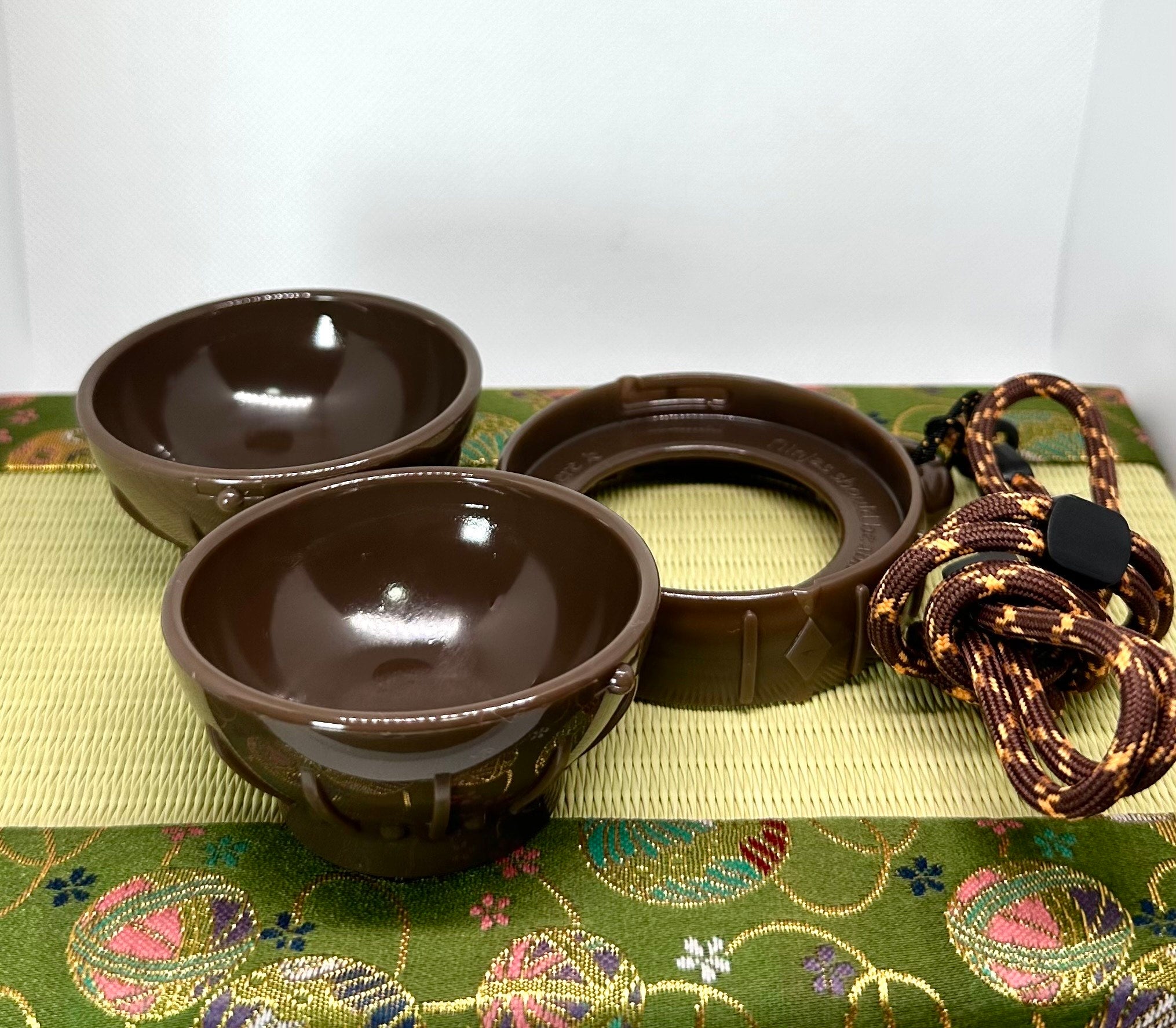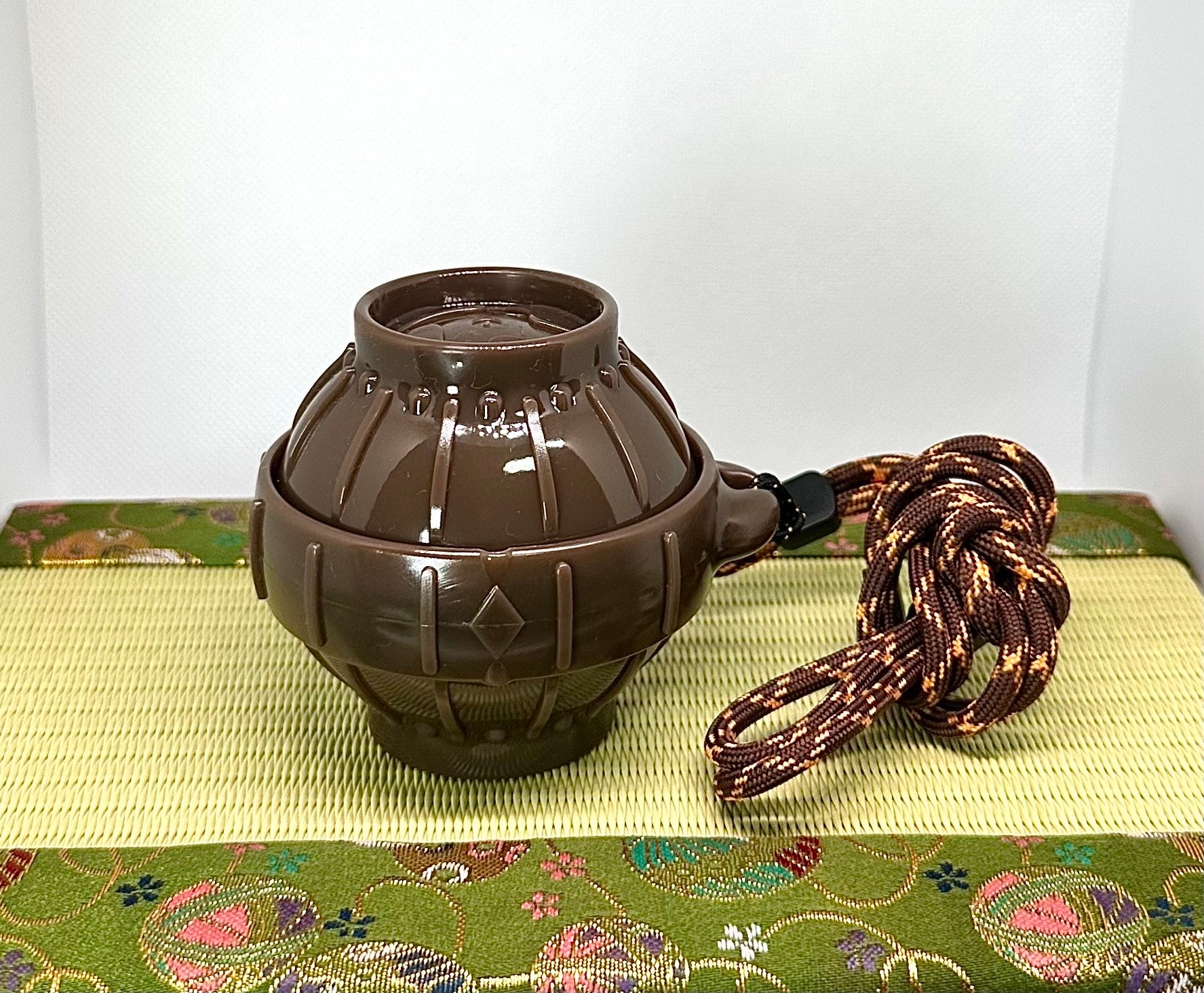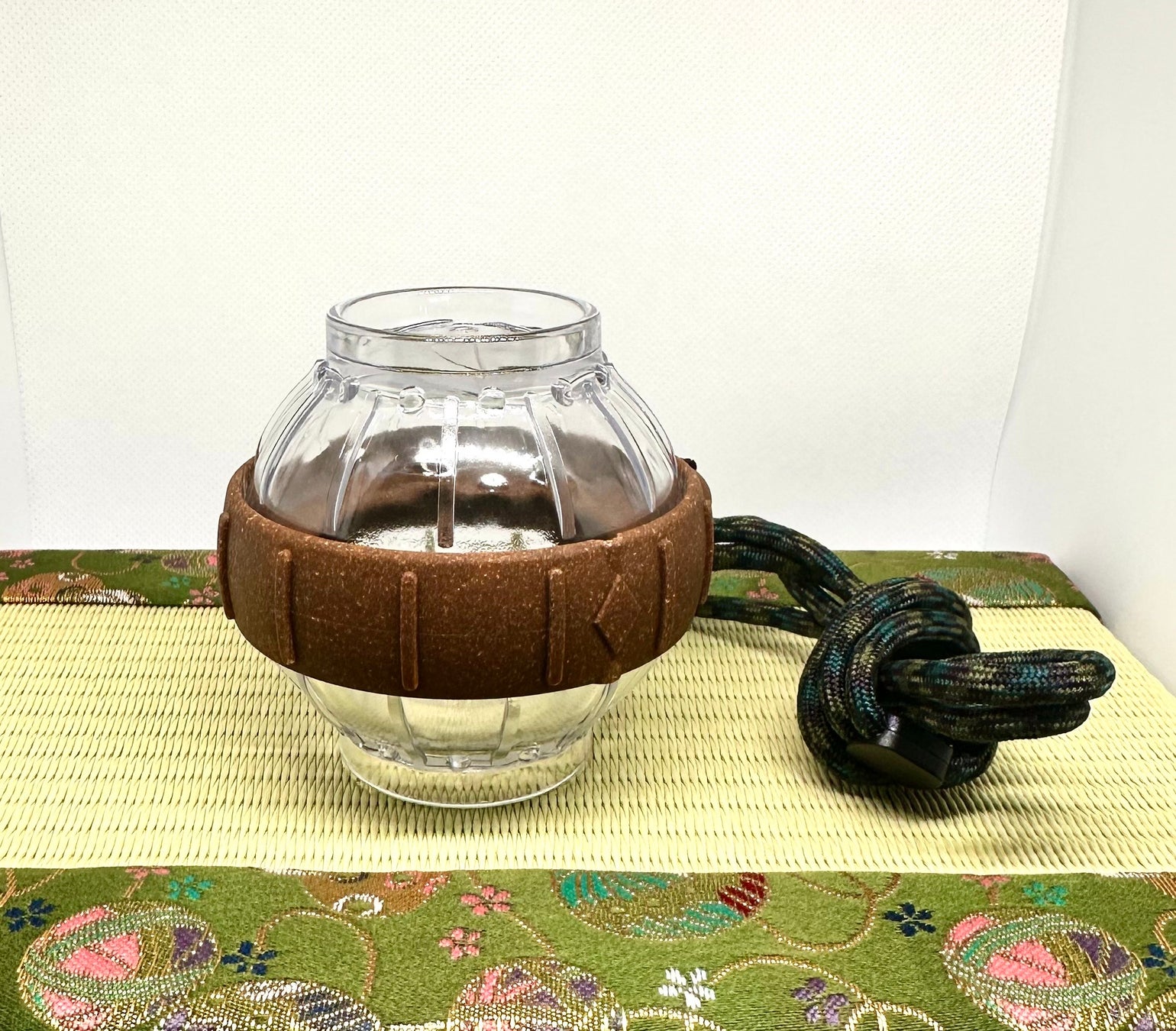 茶釜のようなユニークなルックスで携帯のようにお好みのストラップで首にかけ、持ち運びができます。両サイドには2つのおちょこが付いています。おちょこには手裏剣マークが入っています。
