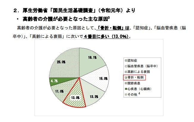 また高齢者の介護が必要になる原因として「骨折・転倒が」認知症や脳卒中、高齢による衰弱に次いで4番目に多いとされています。