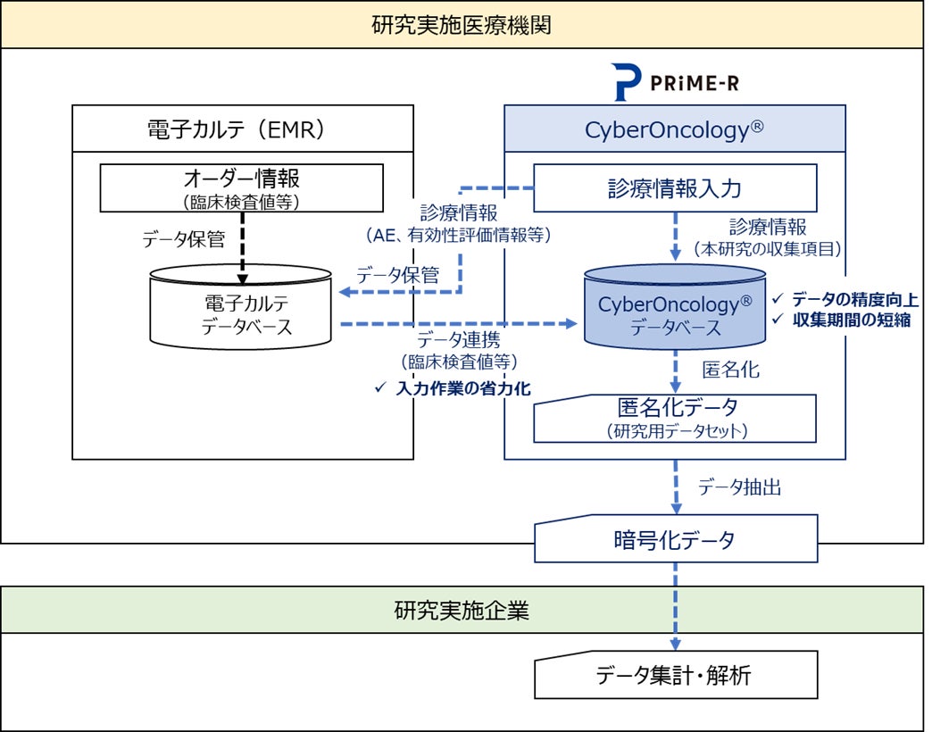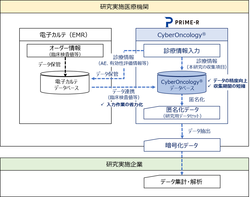 PRiME-Rは、製薬企業からの委託を受け、医療機関内のCyberOncology®のサーバに蓄積されている構造化データの検索・匿名化・抽出作業・暗号化を実施します。解析に必要な症例および必要なデータ項目は、CyberOncology®を通じて、匿名化されたデータセットとして、抽出します。また、医療機関外への抽出データの移行の際は、データを暗号化して取り扱います。