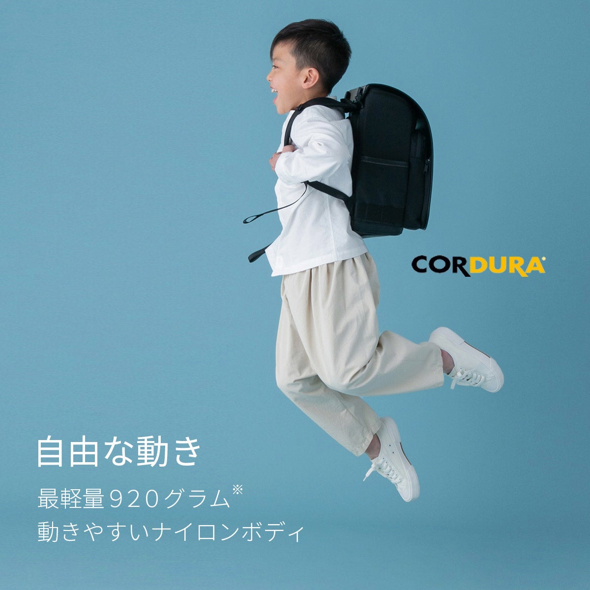 ● 最軽量920gナイロンボディで、体への負担を軽減。手ぶら通学できる工夫も。