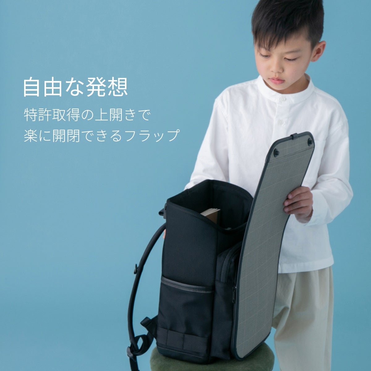 明治30年に生まれたランドセルは色や素材といったバリエーションは増えたものの、その骨格は変化していません。多様な個性が尊重される今、こどもが自らの個性を愉しめる、そんな「自由な」ランドセルをつくりました。心の自由に加え、軽くて手ぶらで通学できるので、子どもらしく自由に体を動かせます。