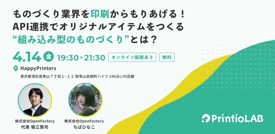 初回となる2023年4月14日(金)は世界一ワクワクする印刷工場〈HappyPrinters〉にて、代表の堀江とちばによるトークイベントを実施します。初回のテーマは「ものづくり業界を印刷からもりあげる!API連携でオリジナルアイテムをつくる“組み込み型のものづくり”とは?」