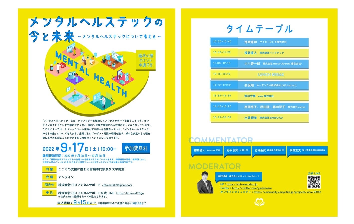 テクノロジーを駆使するメンタルサポート「メンタルヘルステック」。それを軸とする様々な企業をゲストに、「メンタルヘルステックの今と未来」について考えるセミナーとなっております。