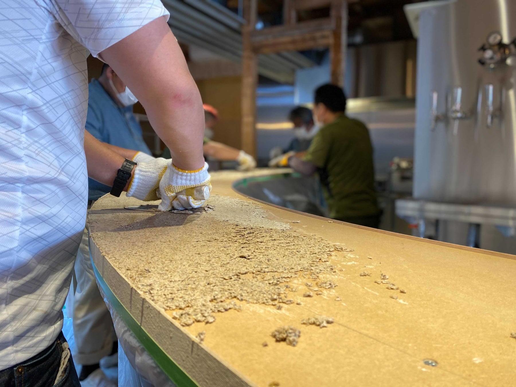 テーブルには麦芽カスを混ぜ込んだ塗料を使用して完成させた。
