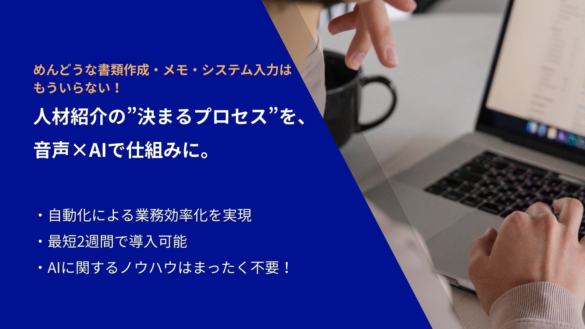 面談後の書類作成や記録作成をボタン1つで自動化し、最短2週間で導入が可能。さらに、1か月間の返金保証プランも用意し、年度初めから他社をリードしたい人材紹介会社の”現状打破”を強力にサポートします。
