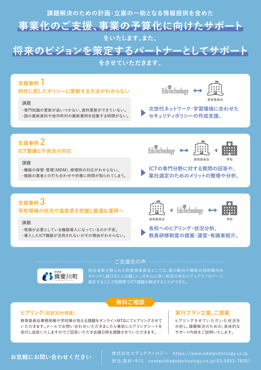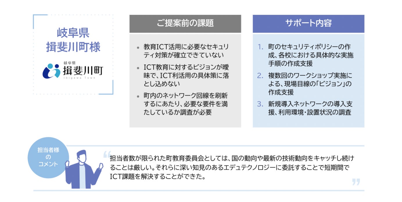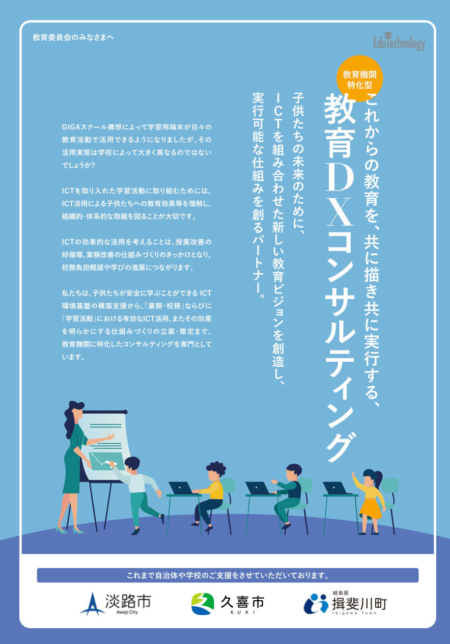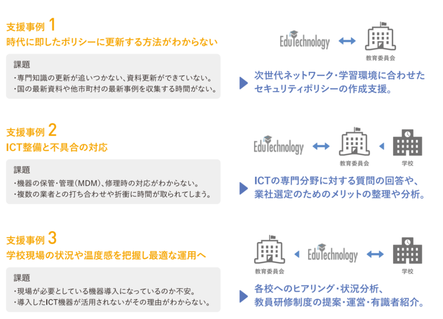 また、課題解決の提案だけでなく、教育委員会や学校の取り組みに伴走し、課題解決はもとより、ウェルビーイングの理念を踏まえたこれからの教育の実現に向けサポートしてまいります。
