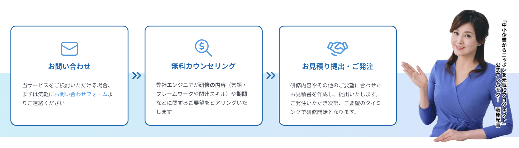 ご発注前に「どんな研修にしたいか」をヒアリングさせていただくステップを踏まえ、お客様に最適なカリキュラムをご提案させていただきます。