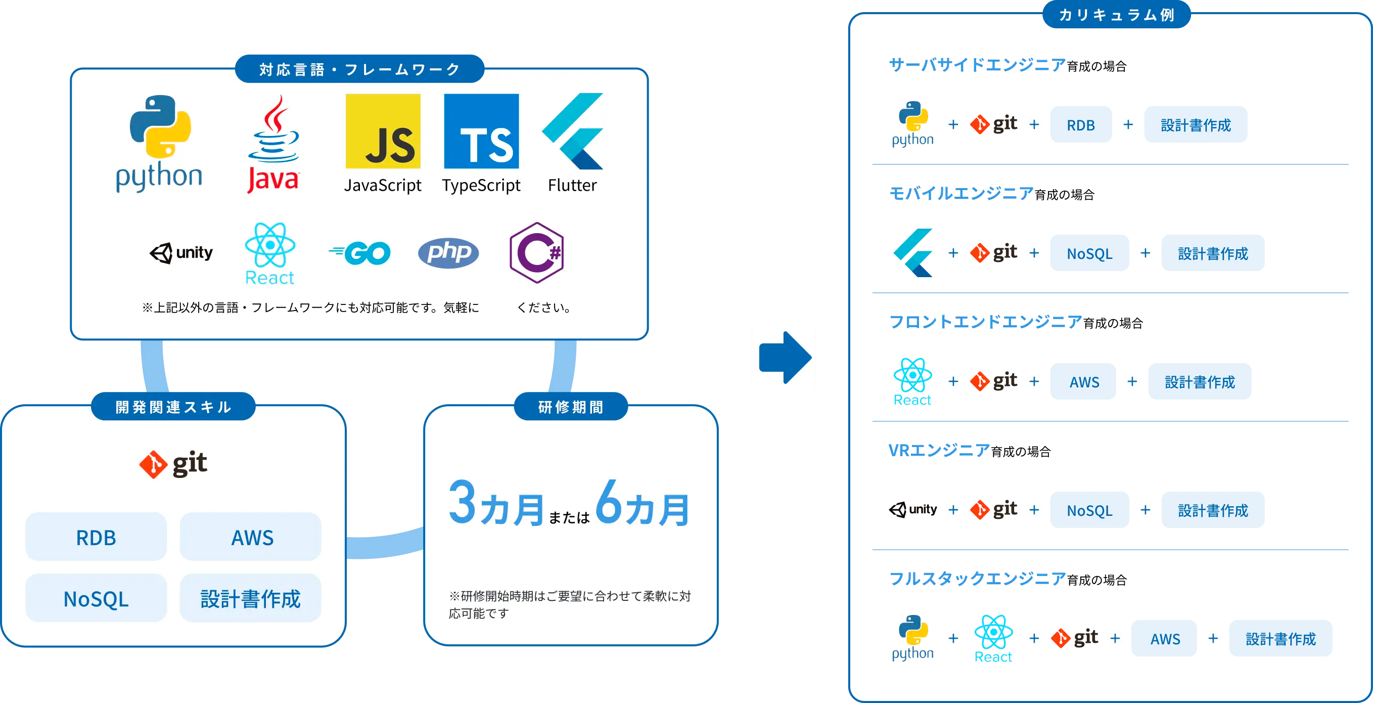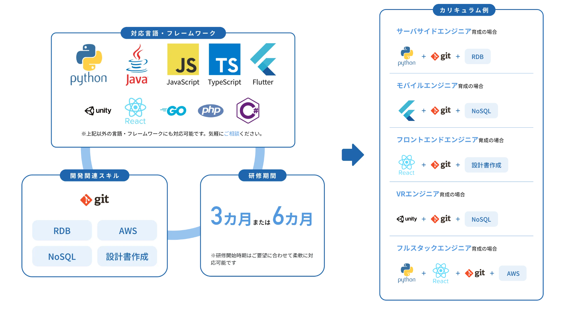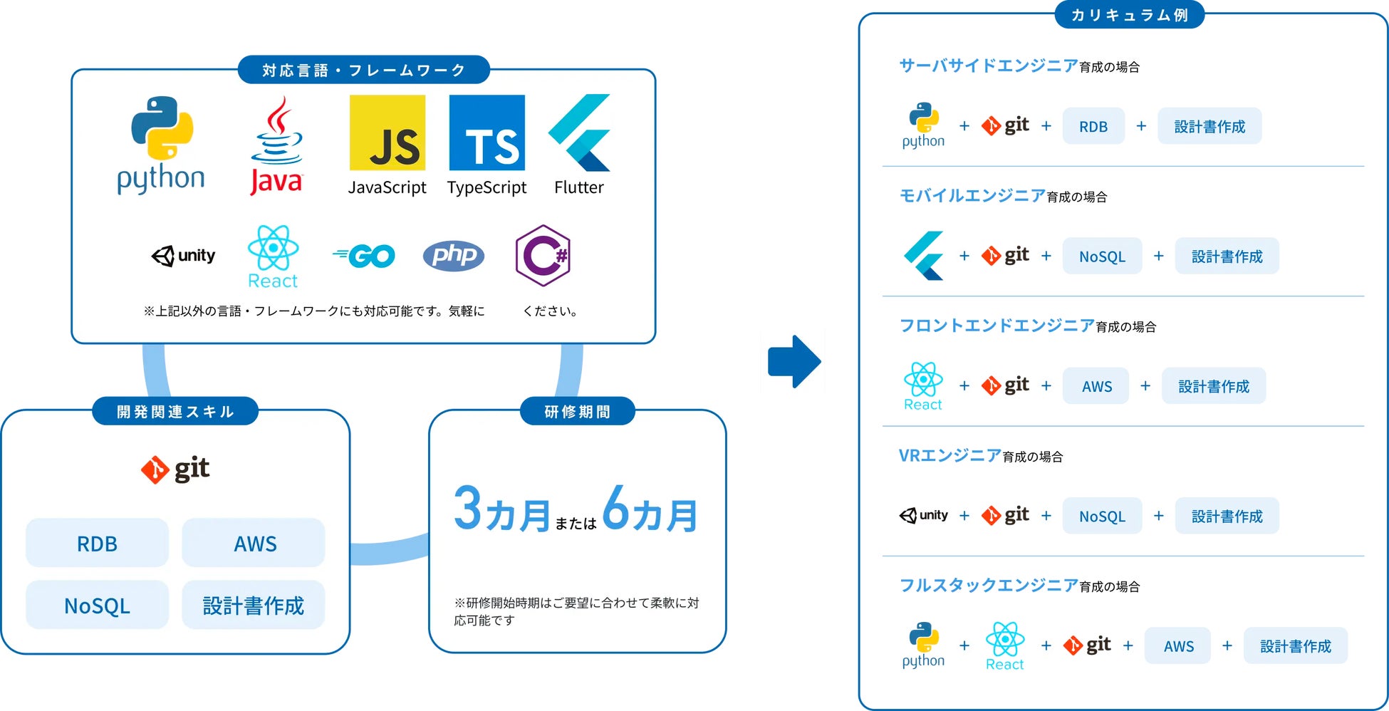 対応言語・フレームワークや開発関連スキルからオーダーメイドのカリキュラムを作成し、
