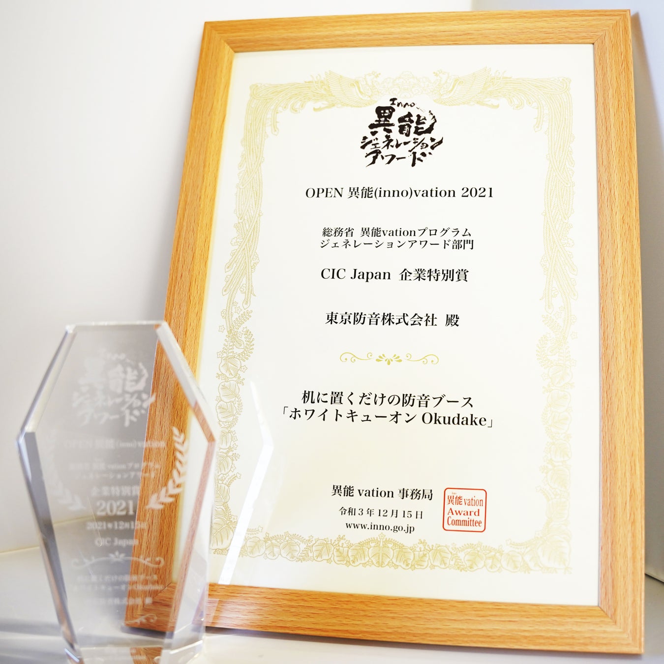 近年では住宅環境の変化によるマンションの増加や、都市部への人口集中などによって、より一般家庭における防音のニーズが広まりました。さらにコロナ禍を経て、防音という概念がより多くの皆様にとって身近になりました。中でもテレワークや飛沫感染対策用に開発した「ホワイトキューオンOkudake」は、応援購入サービスMakuakeにて目標金額335%を達成し、総務省主催「異能vationジェネレーションアワード」にて企業特別賞を受賞しました。